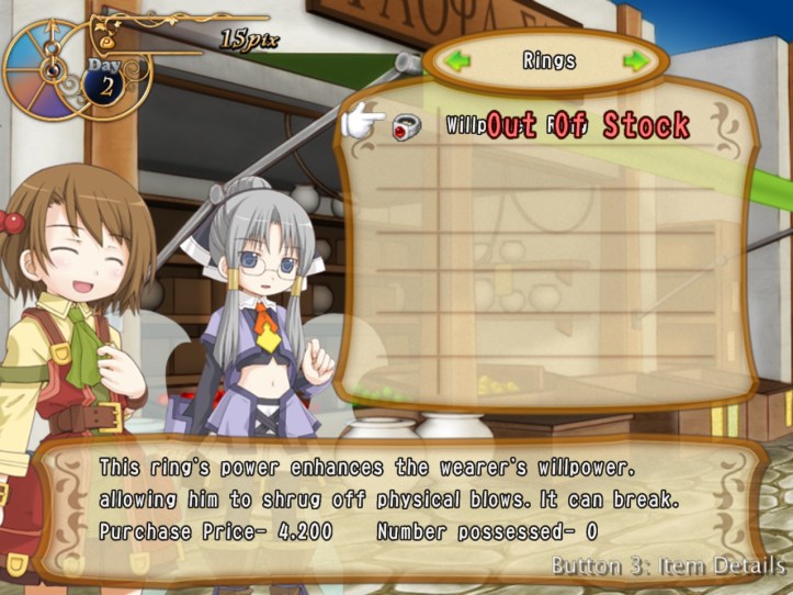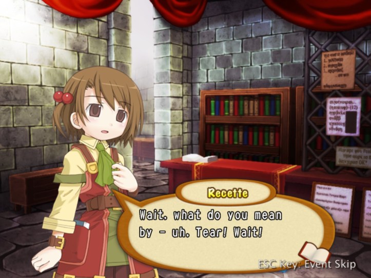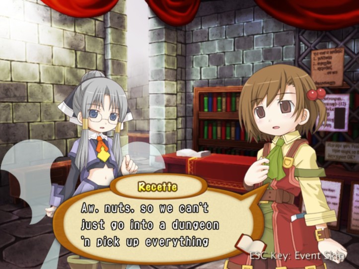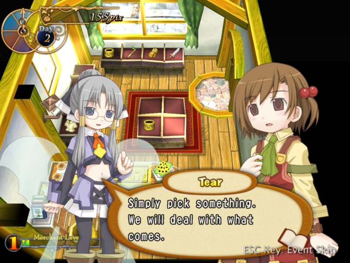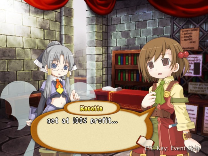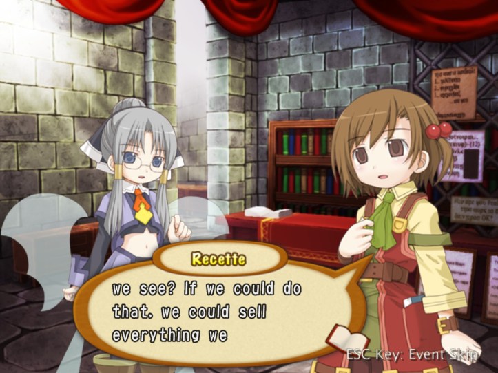 Actually a really good question. What I’ll be doing now is continuing with Part 3 of the ongoing and extremely epic Let’s Play of Recettear. As I’ve mentioned, I’ll be aiming to cut down a little bit on the amount of screenshots I need to insert by instead summarising what’s going on a bit more. It’s not that I don’t want a billion screenshots – if I had the capacity to do this in video form and thus not miss out on a single moment, I would – it’s just that it takes too darn long. Also, I’m only on the free WordPress plan (for now) and therefore don’t have that much storage space to play with.