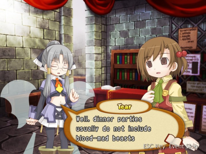 Heavens indeed. Tear’s unbelievable deduction abilities kick in at this point: her analysis of the situation is that this guy seems to be a rookie adventurer who’s mad about his inability to complete the required guild test and earn membership. Yup, there’s a test: they won’t just let anyone in, after all. Apparently, the Adventurers’ Guild is a bit stricter about its entrance criteria than the Merchants’ Guild, judging from the fact that Recettear managed to get registration without having any credentials whatsoever. All of this gives Tear an idea. You’d think Recette would be concerned, since Tear’s last idea was to enlist Recette for what amounts to child slavery, but whatever.