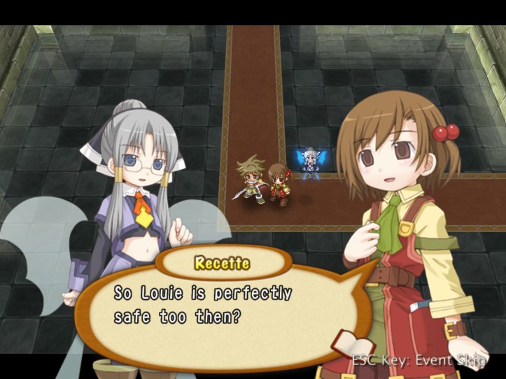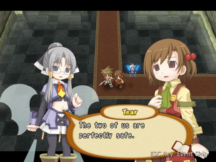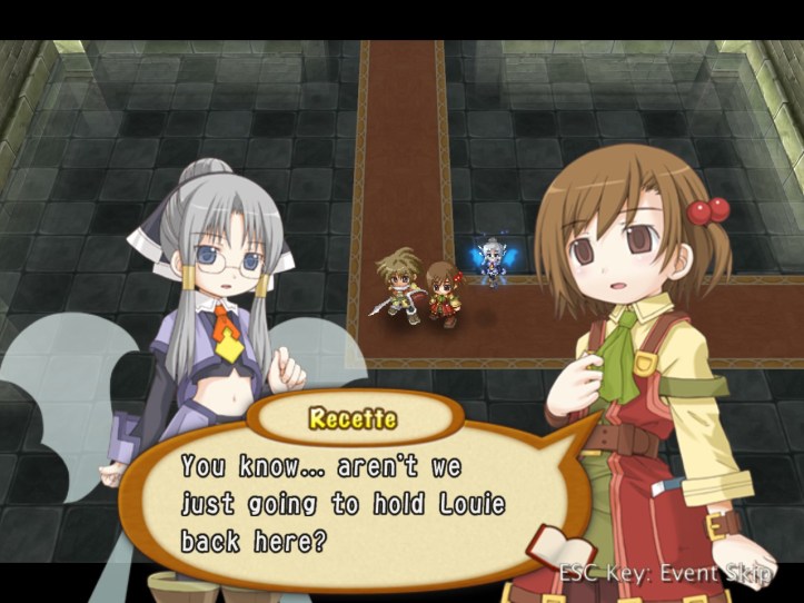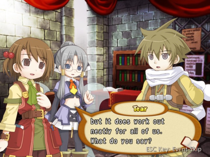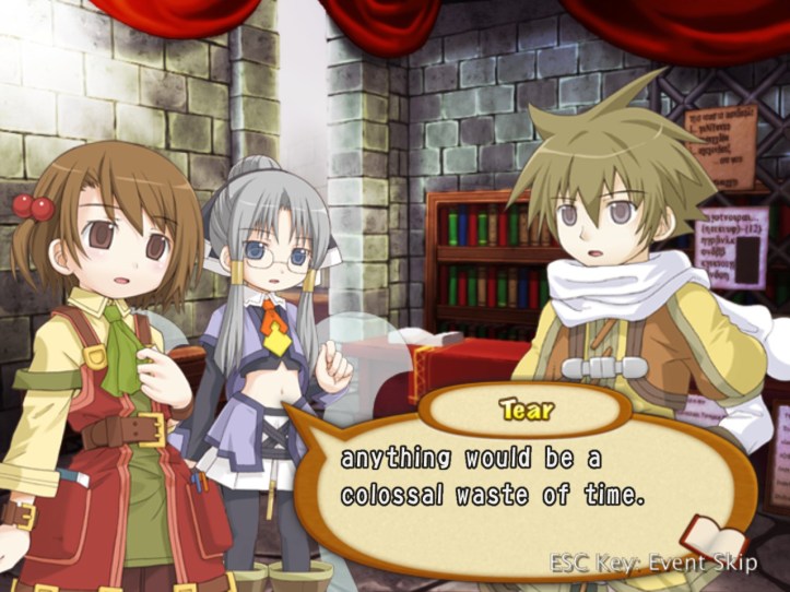 We opt to leave the shop. For some reason, the Adventurers’ Guild is flashing on the map, so I figure we’ll check it out. When we arrive (an action which takes NO ARBITRARY UNITS OF TIME, y’all), Recette asks Tear what this place is. You’d think she’d have figured it out from the flashing logo, but whatever. Tear explains that it’s the Adventurers’ Guild, surprising nobody, and that they’re responsible for managing the various dangerous areas around the city, commonly termed ‘dungeons’.