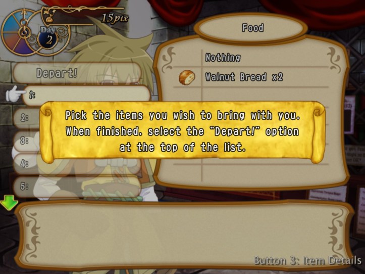 We’ll bring along our precious, precious walnut bread. Looks as if we can bring a maximum of twenty items each time we go to a dungeon, which ain’t bad.