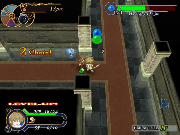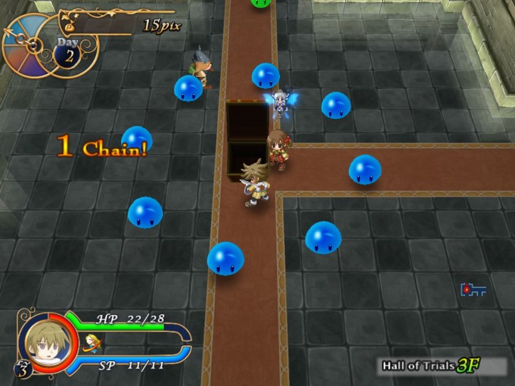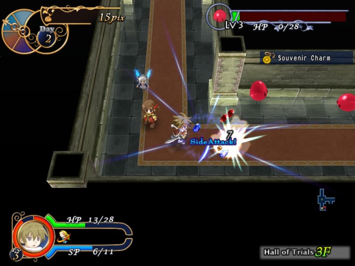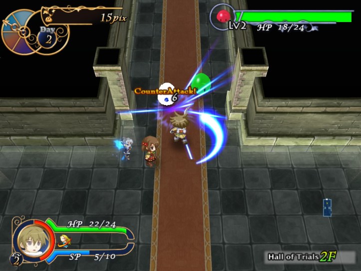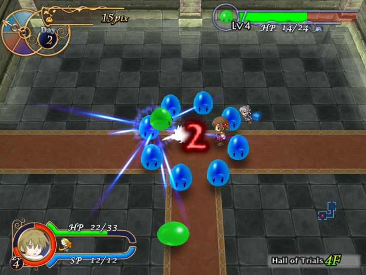 Side note: I really was not very good at taking screenshots during this bit. You’ll just have to trust me when I say that we beat up a few slimes, learned how to do a special attack that strikes in a circle, and gathered some experience points. And an apple.