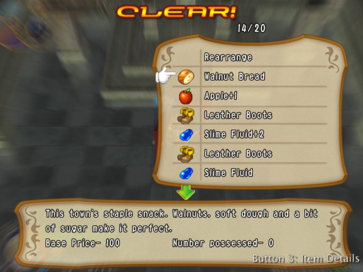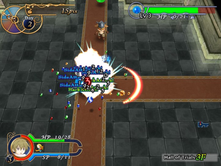 These guys aren’t too bad. They’re sturdier than the slimes, but not as quick as the goats. Defeating enemies causes them to drop little gems which look rather like Zelda-style rupees, and which I infer are probably experience points for Louie.