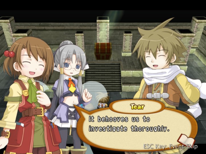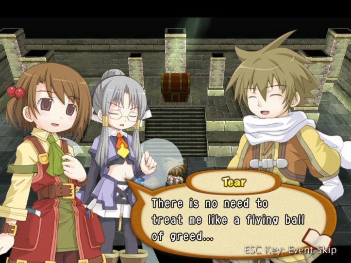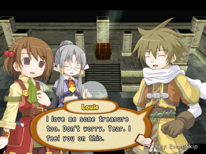 We proceed through the dungeon, killing slimes and looting their flesh. There are also a few treasure chests scattered about, which don’t tend to contain anything any better than the random crap lying around on the floor and stuff. Hannah gets a bit hung up on the whole ‘Recette’s dad is a dick’ theory.