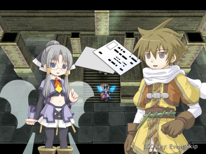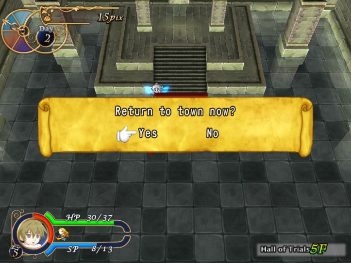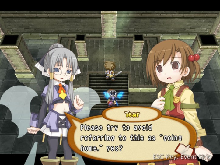 At this point, Hannah pops off to make a cup of tea. While she does that, Tear explains that the door is a ‘Goho – oh, wait, no, a Door of Return’. I didn’t quite get this, but apparently it’s a joke referring to either Doraemon, Persona or Disgaea. She also explains that they generally appear about every five levels in a dungeon, and it’s usually worth popping out to save, avoid having to start again from the beginning, and all that good stuff. The only downside is that we’ll have to re-hire our adventurer if we leave and come back.