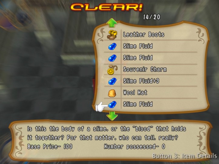 We proceed through the second floor of the dungeon, encountering a few green and red slimes and not much else. They drop items helpfully called ‘slimes’, which we can take and, I’m guessing, sell when we get back.