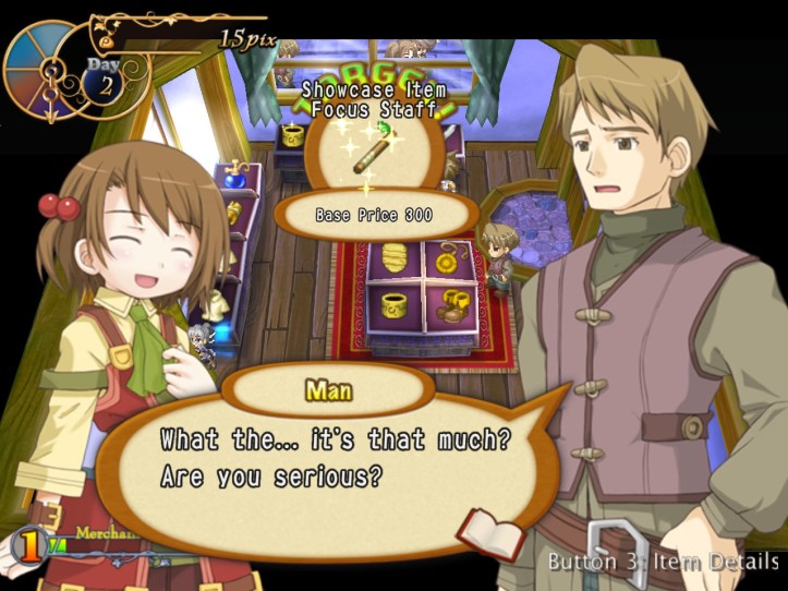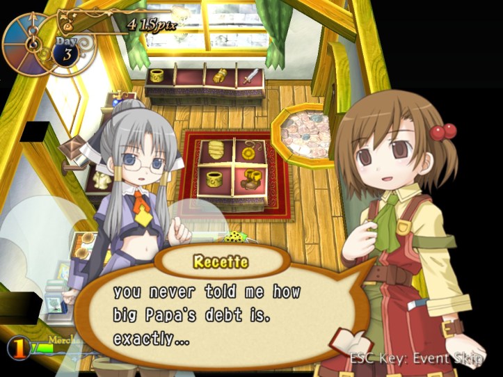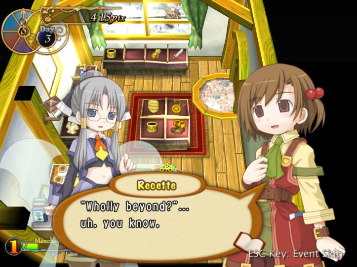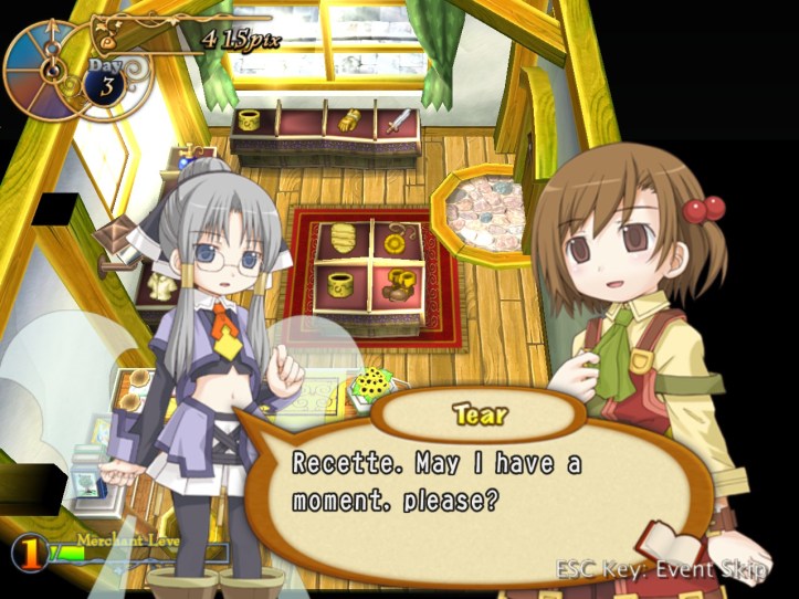 C: Yeah, the only reason Recette’s running the item shop is so she can pay Tear’s company back, and we have payments due… luckily, it’s a really weird loan where they just help you run an item shop. But yeah, our dad just disappeared. Got into a fight with a dragon.