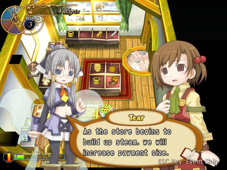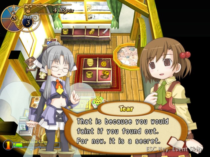 C: Not a clue. So her dad had this massive debt with a loan company owned by fairies, so she – Tear – came to collect the debt. Basically, cos we couldn’t pay it back, she was like ‘well, you’ll have to open an item shop, then, to pay it back’