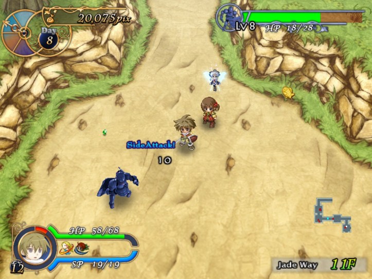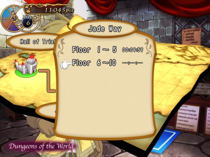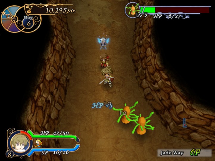 Having raised the 10K I need to make my first repayment to Tear’s weird-ass ‘finance company’, I figure we may as well go back and see what lies in the Jade Way beyond the Crowned Slime’s floor. Louie’s up to level 8 after our escapades in the dungeon last time! (Pretty sure I levelled him up more than that the first time, but it’s still not bad.) Let’s head back into that place and see what bountiful treasures lie beyond the fifth floor.