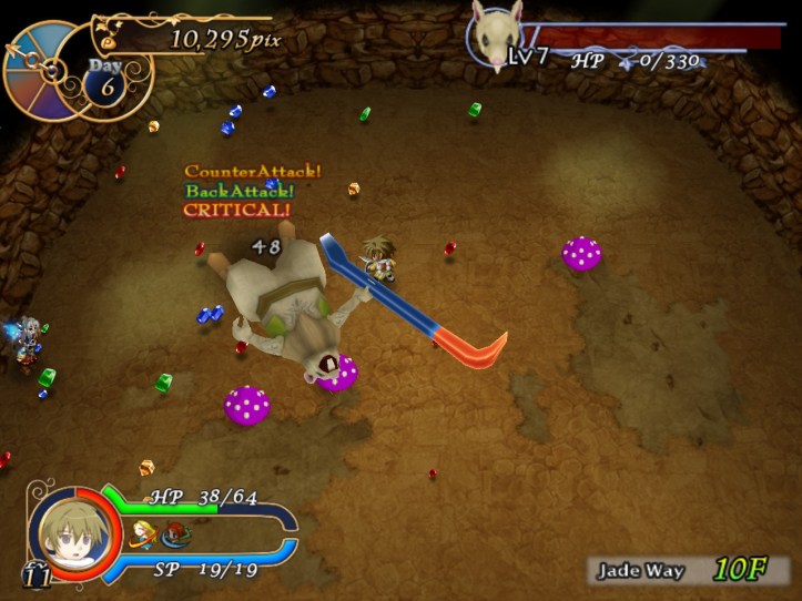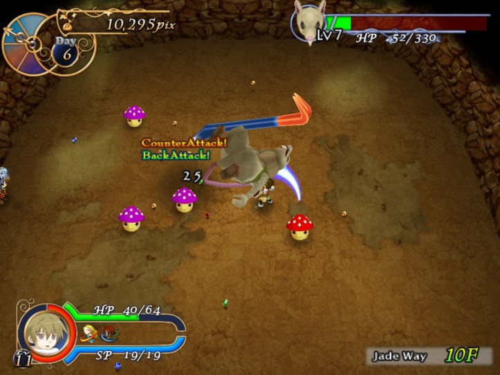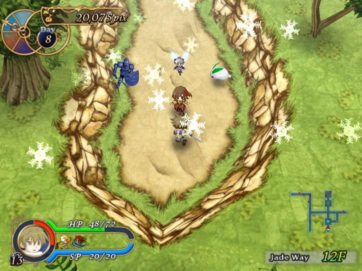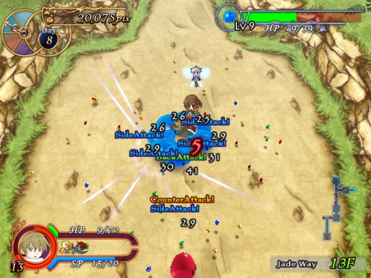 By 12F, we’re starting to get swarmed by flocks of enemies – luckily, only things I can deal with like mushrooms and slimes seem to show up in hordes, but I’m guessing it’ll get worse. Fortunately, the upbeat music as we wander through the dungeon is keeping me happy! I don’t actually play with the sound on that much, so I’m also learning that every time Louie gets hit, Recette asks him if he’s okay (‘daijoubu desu ka?!’), which is very sweet. She has a few other little soundbytes, too, but my Japanese isn’t good enough to try working out what they are!
