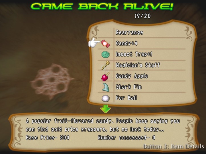 Unfortunately, I don’t have any food left except a single piece of candy, but hopefully we’ll pick some up. I also take along an insect trap that a wasp dropped on my last run – isn’t it kind of weird that a wasp would have something designed for killing wasps? – on the off-chance that I can actually use it myself rather than having to sell it.