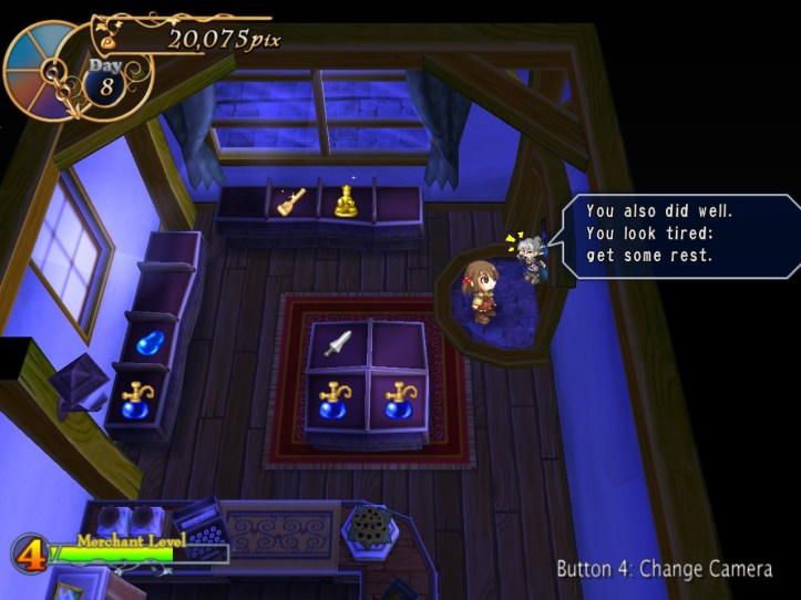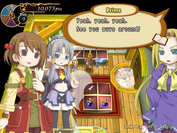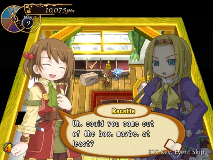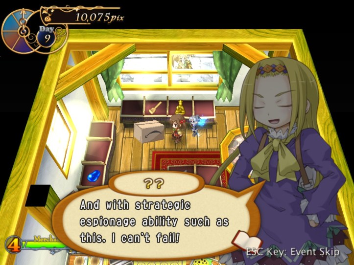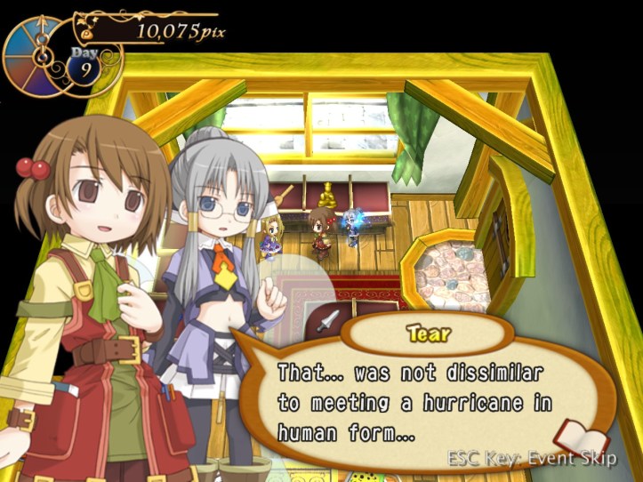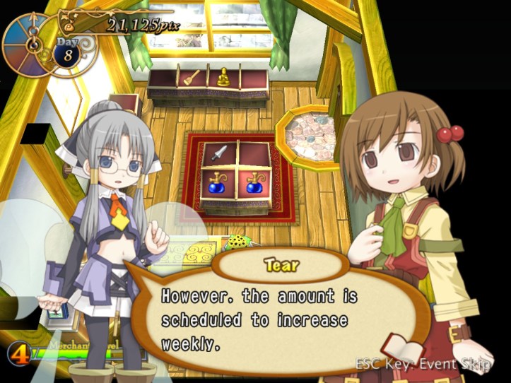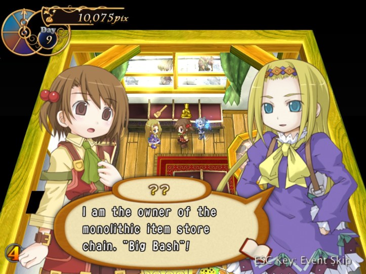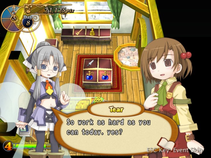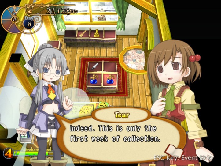[…] the end of the last session of Recettear, we’d just managed to put up the requisite 10,000 pix for our first week’s payment. Big […]
