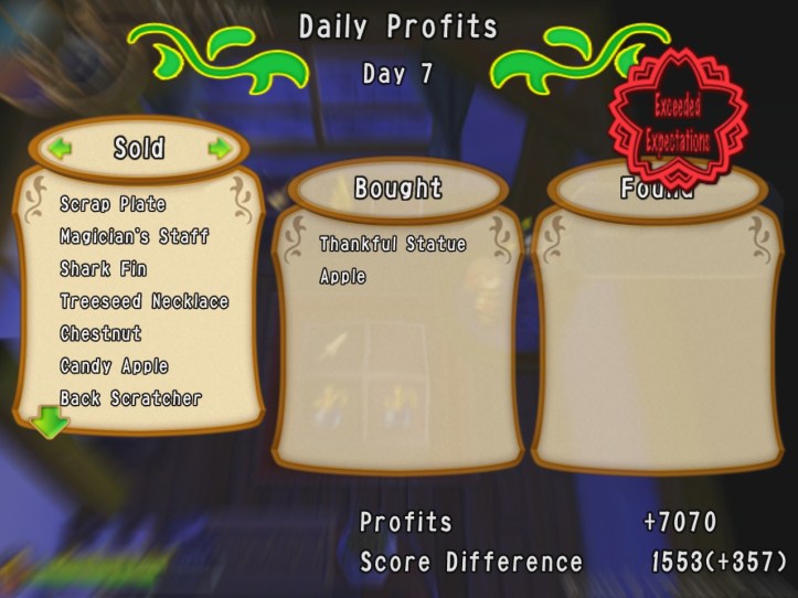 I don’t think I’ve had a single day so far where I haven’t exceeded expectations. I’m a pretty awesome shopkeeper! (Slash-dungeon-crawler-slash-cuckoolander-slash-indentured-orphan.) We’re now on Day 7, with payment number 1 due tomorrow on Day 8; I figure it’s probably a good idea to spend this day just selling, so I’ve still got enough money left to buy more stuff once that 10 grand gets deducted.