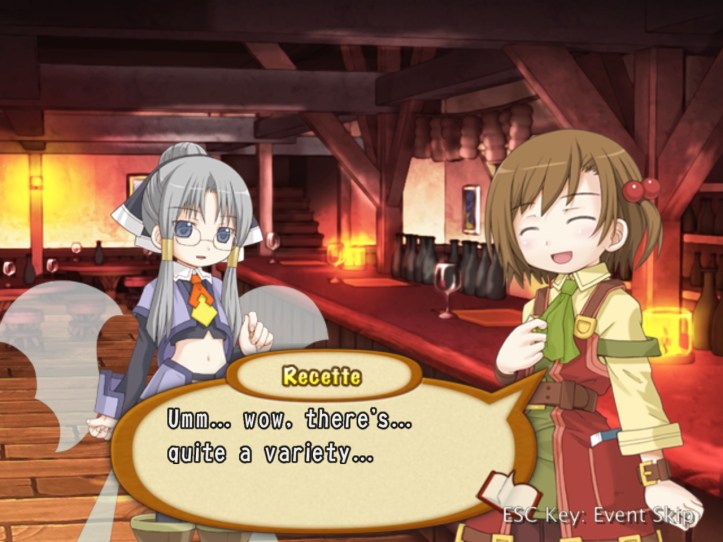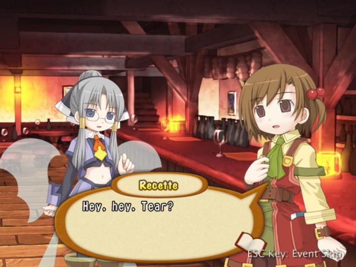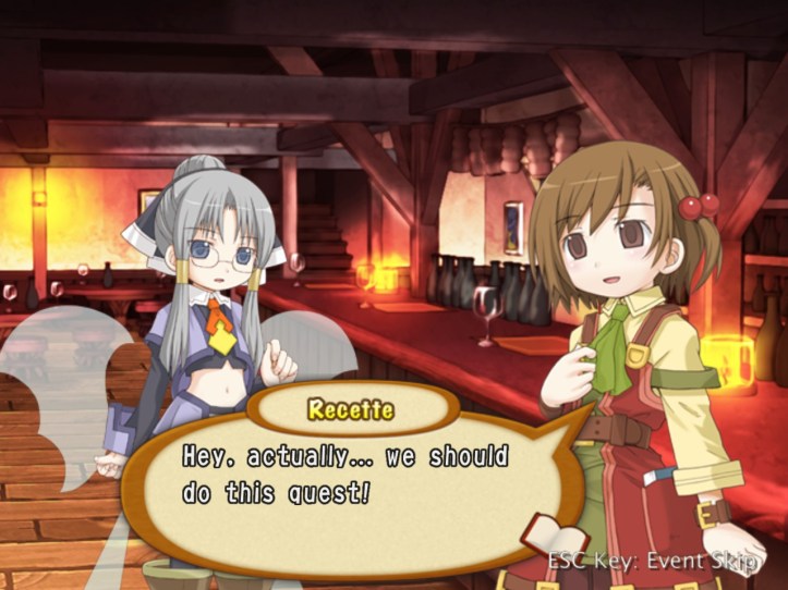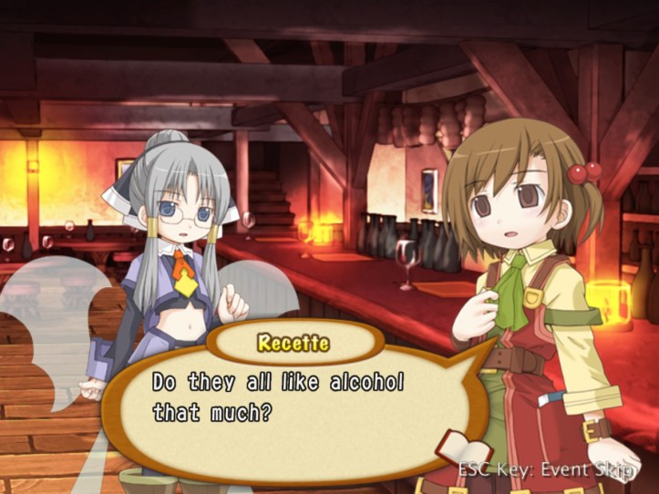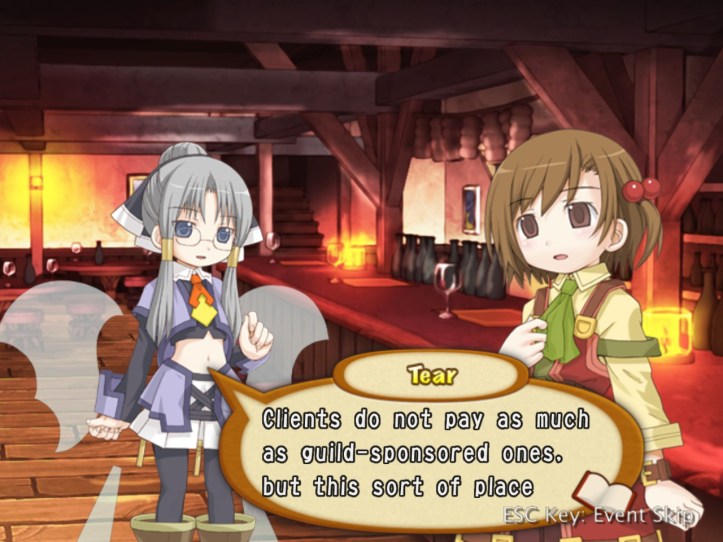 Tear answers that adventurers do indeed enjoy their ‘liquid pleasure’, which sounds a bit dirty to me, but the pub is important for another reason: it also handles quests, so many of the adventurers in the pub are actually there looking for work. Recette sensibly asks why the pub deals with quests when the Adventurer’s Guild is pretty much exclusively for that sort of thing: according to Tear, the whole ‘needing a card to hire an adventurer’ thing puts some less well-to-do clients off the Guild, so the pub deals with a slightly different portfolio.