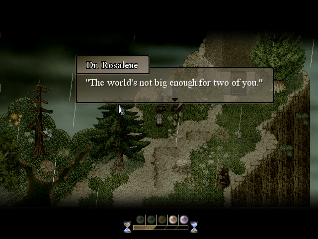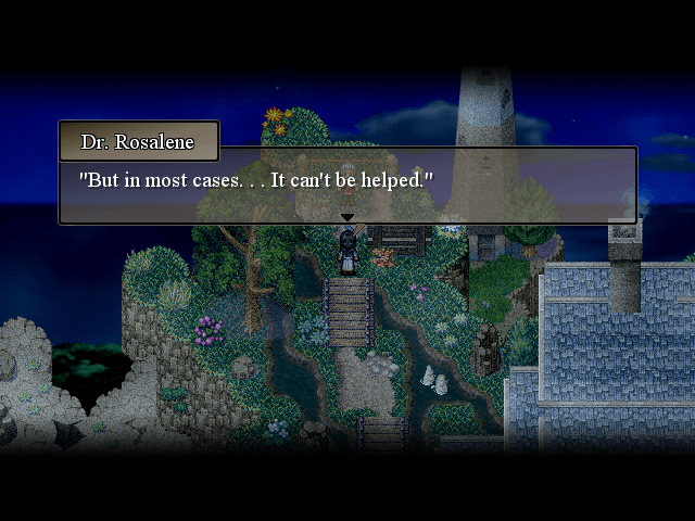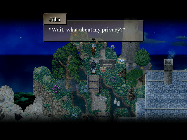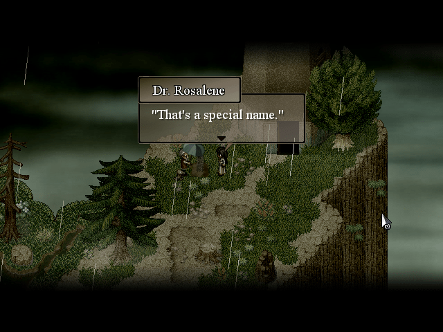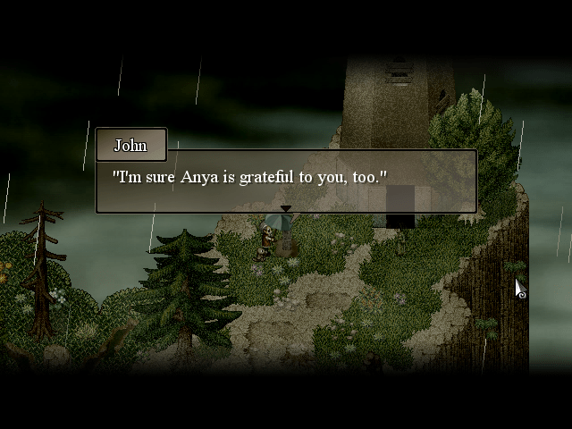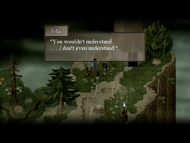 Looks as if we’re only making very small jumps at the moment; the timeline at the top shows that we’re heading towards the beginning of the most recent ‘Old-Man-Johnny’ period in little increments. Rosalene wants to move faster, but Neil tells her to enjoy the scenery, which in this case is a rainy scene outside the lighthouse. I wonder whether all these memories are actually going to be important? I mean, the last one didn’t seem all that significant; he just played the piano for a bit and then stopped. I suppose memory’s a weird thing, and I know I definitely remember some really odd and totally insignificant moments very clearly but find myself totally unable to recall important things.