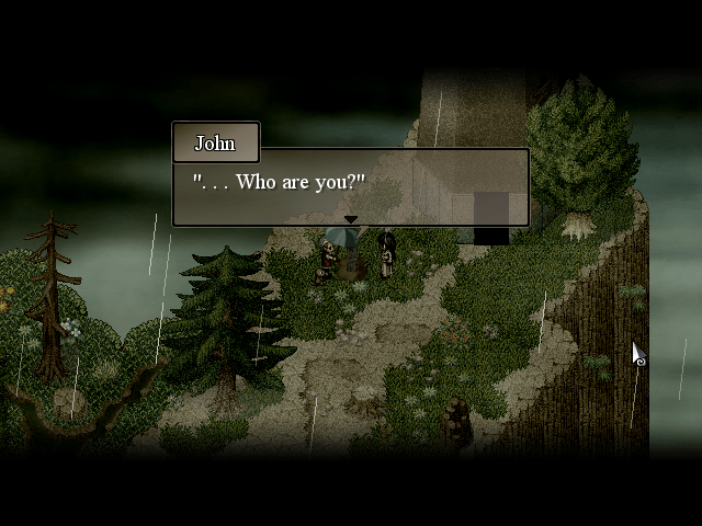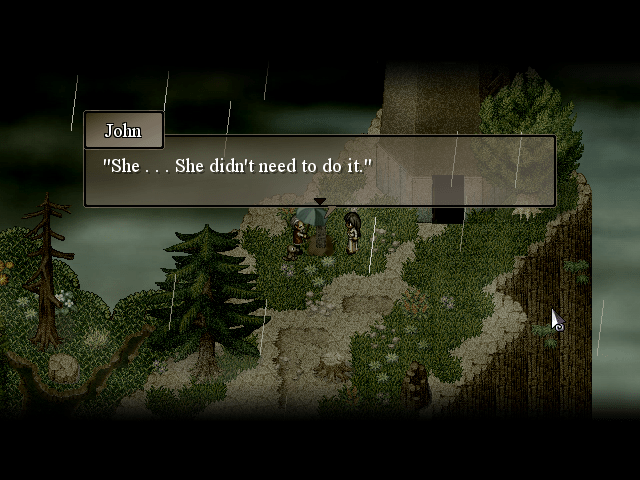 As we enter, Johnny tells River’s grave that something is ‘finished’. Sounds a bit weird at first, but he says that he’ll now be able to watch over ‘her’ every day. I don’t know who the her is; is there a daughter we don’t know about? Maybe his carer is of more personal importance to him than she first appeared. The background music is absolutely lovely in this bit, but I can’t work out which tune from the OST it is! I think it might be ‘Moonwisher’; it’s hard to tell because the rain gives the in-game track a bit of a different sound. (While I was looking, though, I did manage to find the RPG battle theme from last time!)