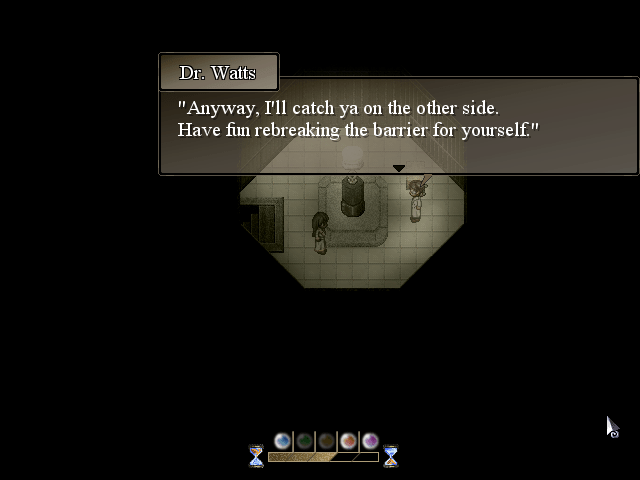 Evidently, Neil’s gone and collected all the links he needs, so he shoots straight off without waiting for Rosalene. Given the size of the room, link number four isn’t too hard to find: the lighthouse’s lamp (broken). Examining it causes another memory-Johnny to show up.