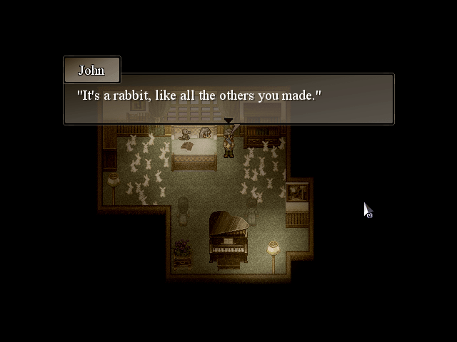 With Johnny’s concerns completely addressed, Rosalene vanishes back into the past. We come out in his house, where he’s playing his own version of ‘For River’. I really like that he and the kids have their own versions; his sounds simpler but is actually more complex in terms of its musical structure, since he’s older and probably more experienced, but the kids’ is a take on the simple theme which is more embellished because they’ve got four hands between them. I’m not sure which version I prefer, but Johnny’s has this kind of sincerity and emotional resonance as I watch him play it, perhaps because I’m starting to work out that it probably means a lot to him (remember, the piece is ‘For River’, and we’ve established that his wife’s name was River). Neil, observant as ever, wonders what the heck is up with all the rabbits and suggests that perhaps they ought to have checked Johnny’s record for any kind of psychopathic tendencies.