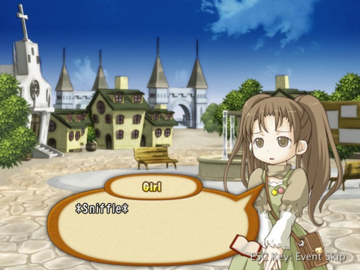 Shelves full once again, I decide to mosey over to the Adventurer’s Guild and see if there’s any more dungeoning we can do. As seems to be becoming standard, though, the Town Square flashes enticingly, so I pop in. The girl whose doll broke is there again, and this time she’s dropped a hairpin.