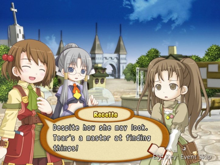 A-haha. Turns out Recette’s actually volunteering Tear for the job, since the fairy can get into any small spaces that the pin might have dropped into. Tear, though not super happy, goes along with it.