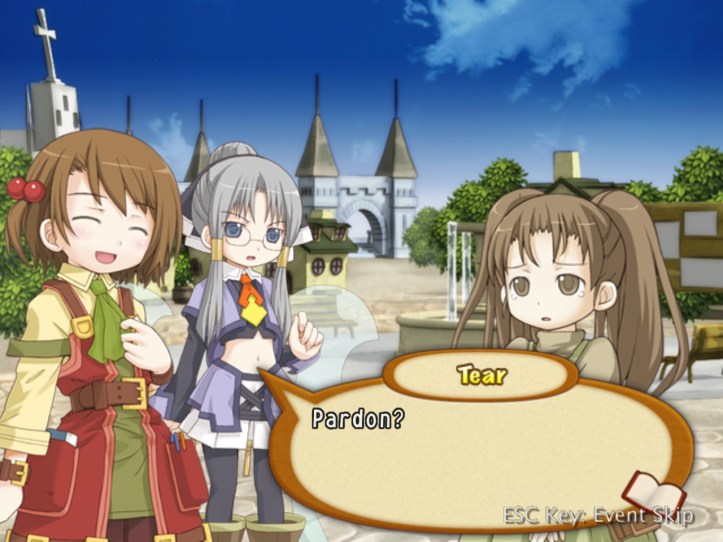 Hmm. Maybe Tear isn’t so wrong to be a bit cautious after all… we’ll see. I think I prefer Recette’s ‘let’s just assume everyone’s awesome unless proven otherwise’ approach, discounting the fact that attempted murder and grand larceny probably counts towards proving otherwise.