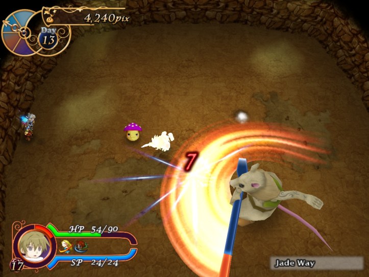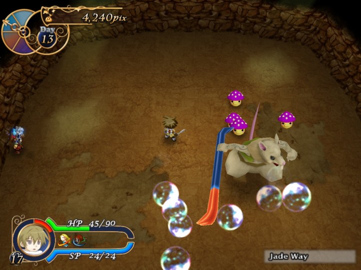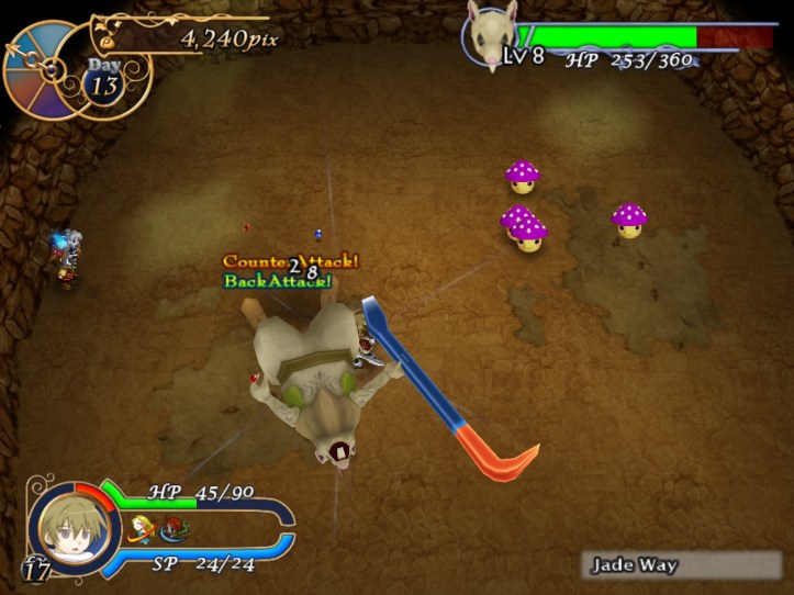 Lucky for me, a load of purple shrooms appear straight away (remember, he heals from eating red ones and gets debuffed from purple ones). Unlucky for me, I spend a while just running away and take a few hits because I forgot that I probably have to hit him at least a couple of times before he’ll eat anything.