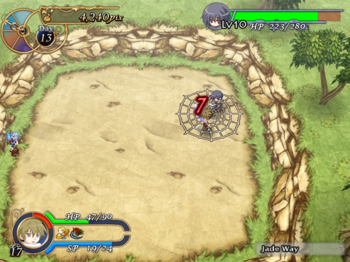 The battle with Charme starts without any fanfare or sneaky thief shenanigans this time, which is probably for the best. Coming from the slow-moving slime and Reg-bro, her speed throws me off enough that I take a few nasty hits and get caught in her webs. She darn near gets the best of me, but I brought enough walnut bread to be able to tough it out and take her down.