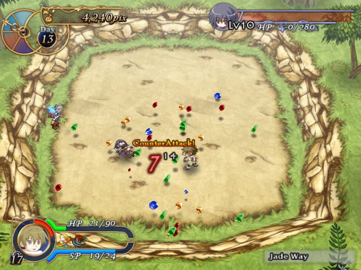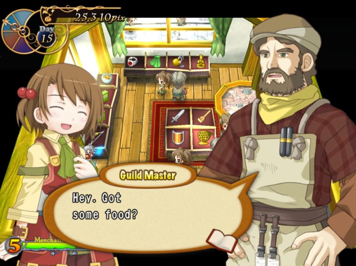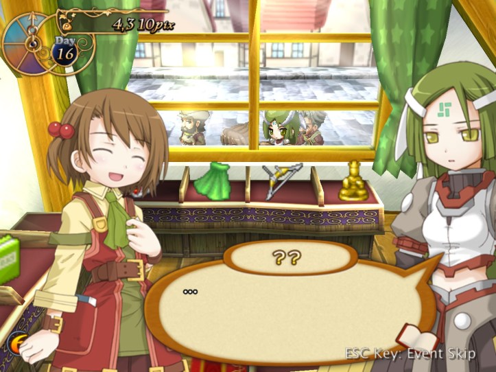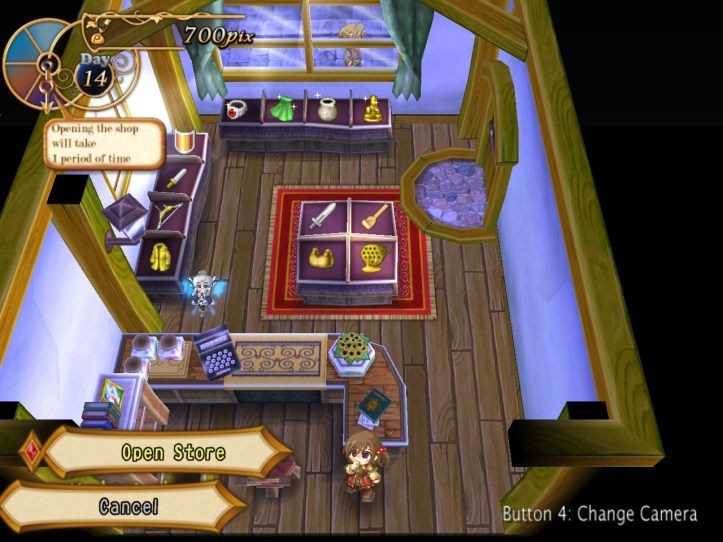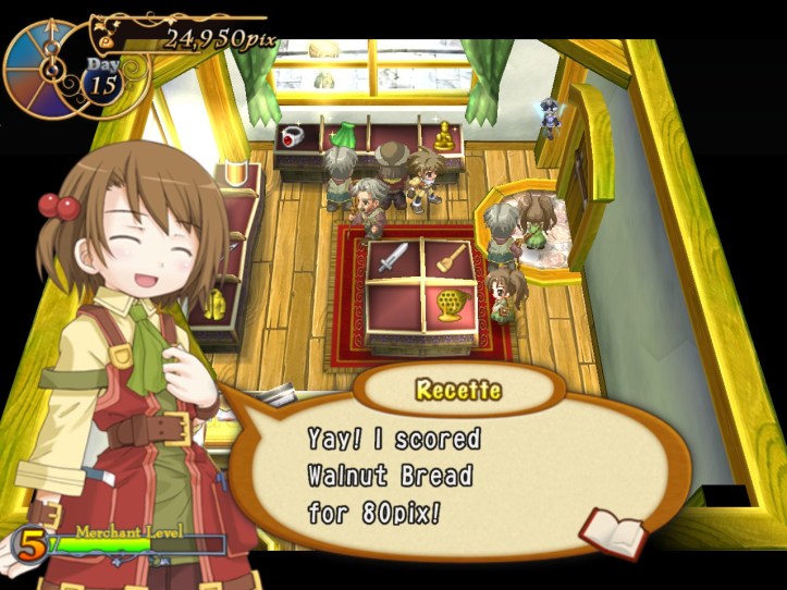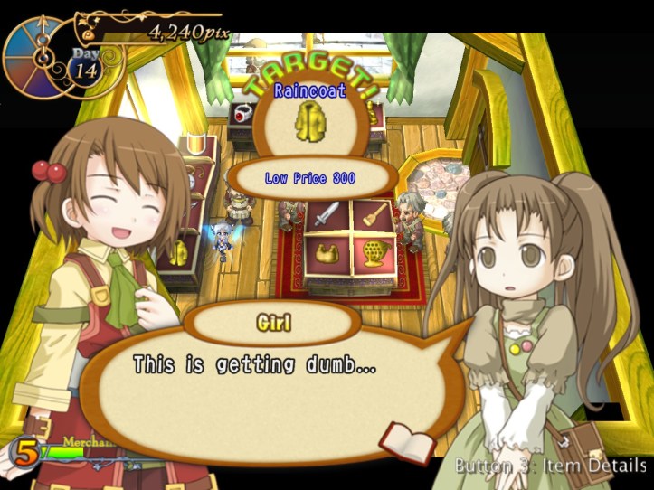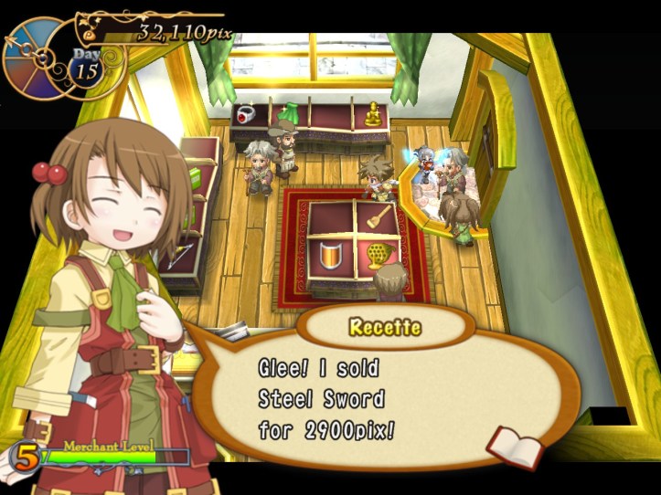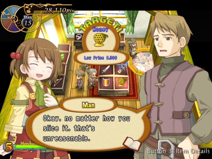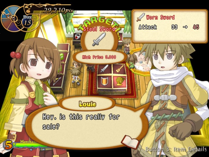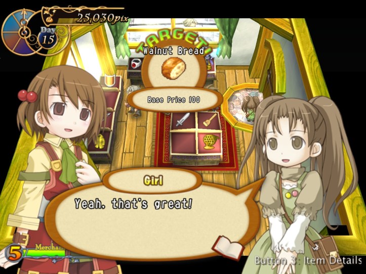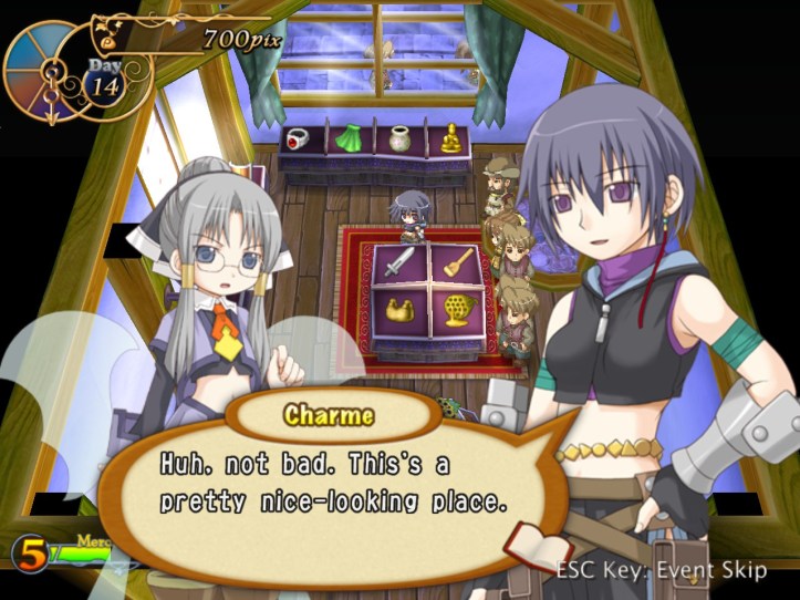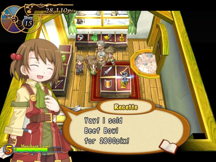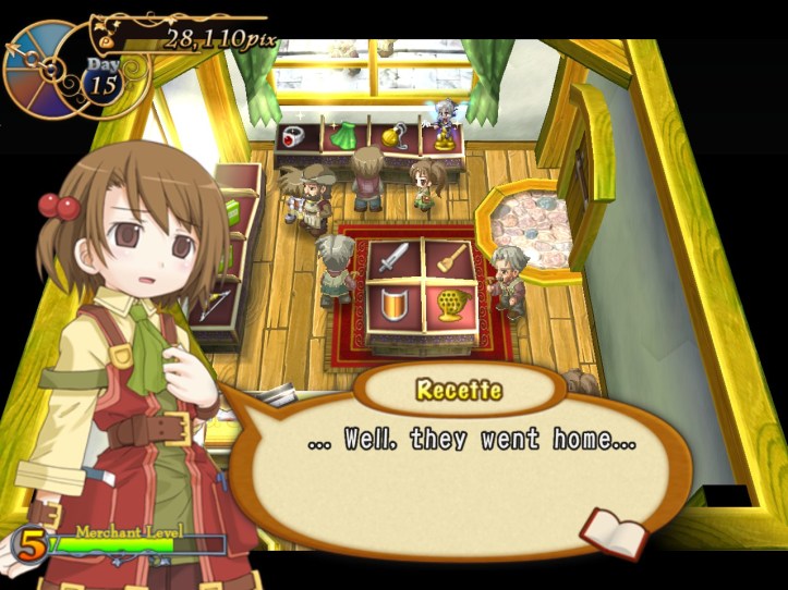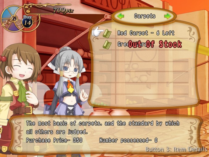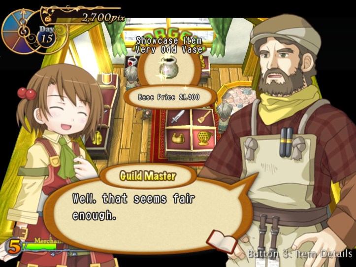 Our shop’s a little bit empty, so I restock the shelves. While I’m at it, I spot that the two items we got from Charme are pretty valuable: the Handknit Muffler, retailing for 3,000 pix, and a Very Odd Pot with a base price of 21,000! I put the pot in the window in the hopes that it might attract some high-end clientele, but I’m thinking I might keep hold of the muffler for now in case Charme comes to reclaim it.
