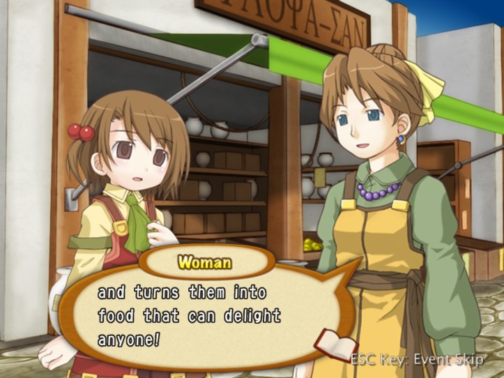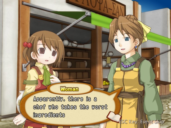 In the market, we meet a lady who’s out shopping for ingredients. She and Recette have a quick chat about the merits of food in general, and she tells us that there’s apparently a legendary chef around who can turn even the most rubbish-est of ingredients into something delicious as heck. I bet it’s Louie.