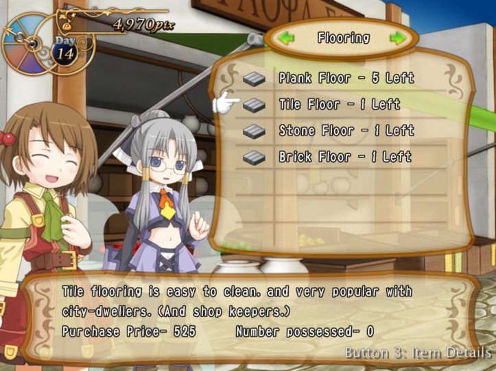I discover that the market sells floors and wallpapers, counters and carpets, which I’m assuming I can put in the store to make people happy-happy and therefore more spendy-spendy! I grab a few bits to decorate.