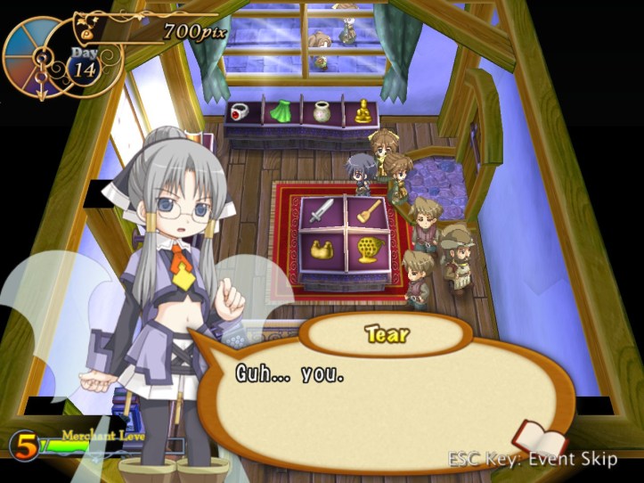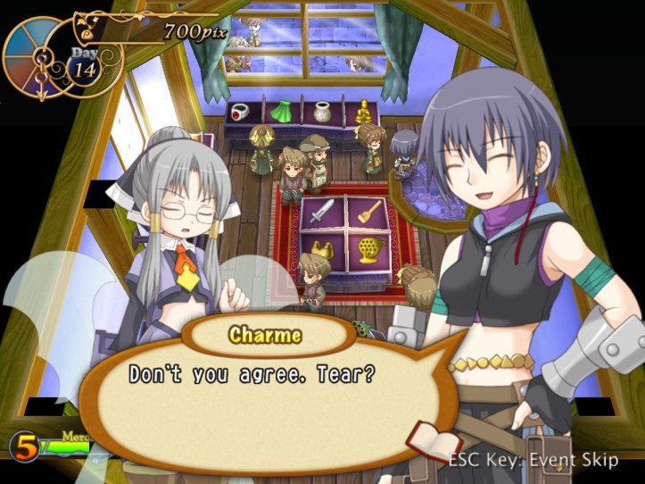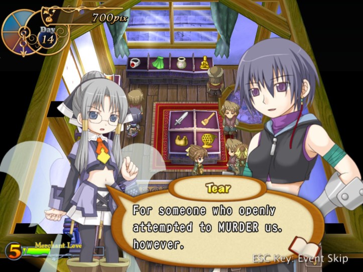 Charme has a bit of banter with Tear about how our fairy friend isn’t the most professional store owner, what with the murderous looks she’s shooting at Thief Waifu, but Tear’s pretty reticent about the whole ‘you tried to murder us so it’s fairly reasonable to be a bit standoffish’ thing.