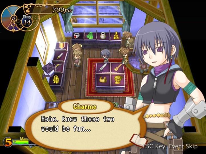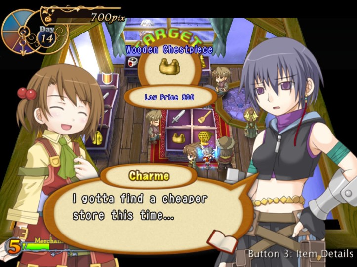Charme actually wants to buy something while she’s here, but unfortunately she doesn’t have the money to buy the breastplate even at 95% of base value (I figured I could get away with giving her a lower price if it might benefit us in future). Damn it, Charme! How do you, an obviously successful thief, not even have 800pix on you?!