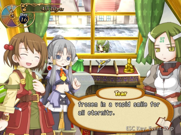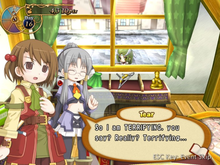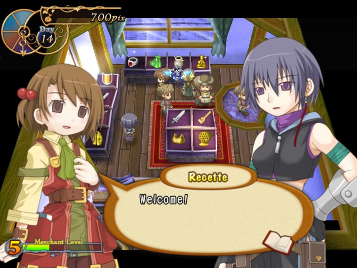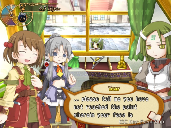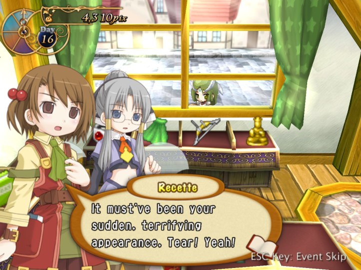 Recette, on the other hand, is overjoyed to see her! Charme says we’ve got a pretty nice store; Recette tells our new friend to make herself at home. I think we’re going to be great friends (though Tear might take a while to win over).