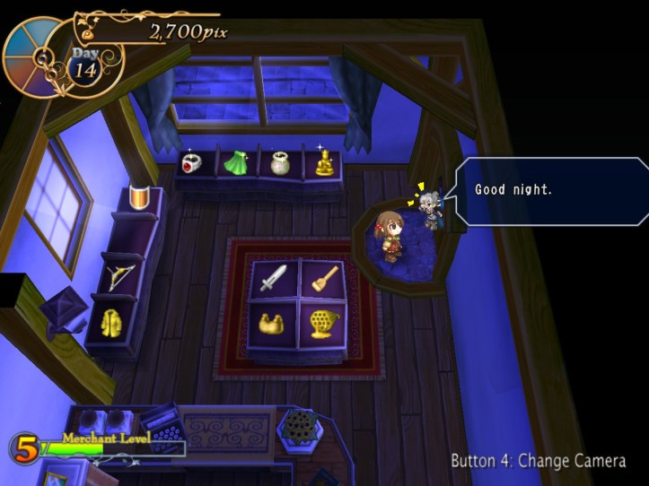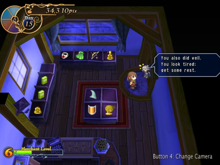After one more lot of selling, I’m doing way better than I had any reason to expect at the beginning of this day. We’re now Merchant Level 6, which is pretty sweet, and we’ll have a good couple of thousand pix left over to get ourselves going again next week. I still think it’s going to be a bit of a dodgy time, but we’ll do our best!