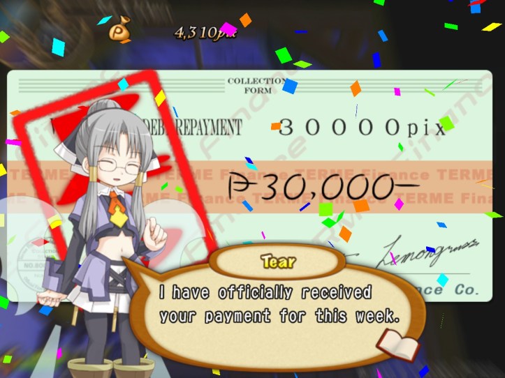 Well, I was going to head straight to the menu and see what we owe this week, but once again there’s a little bit of story progression after the payment. (Remember that we were introduced to Alouette immediately after making our first one, so weekly plot updates seem to be standard.)