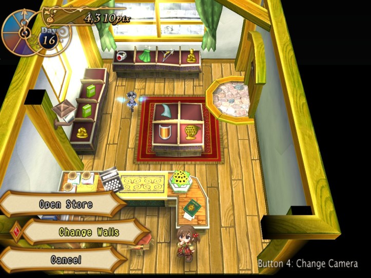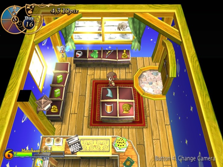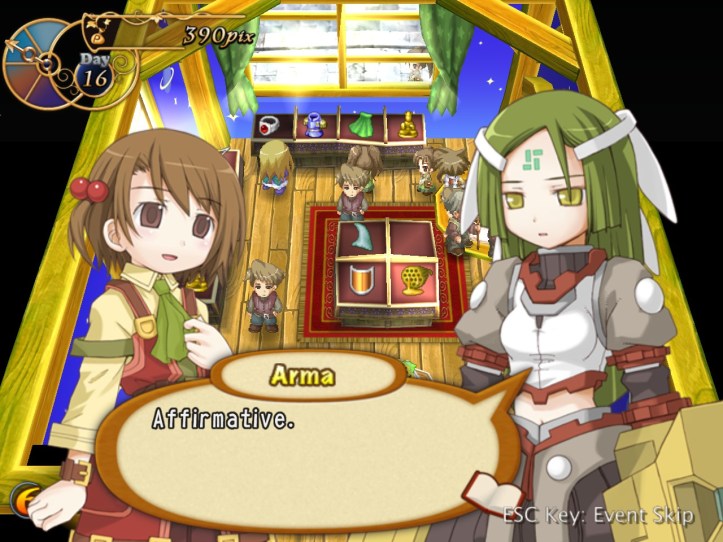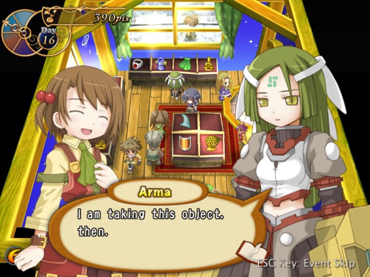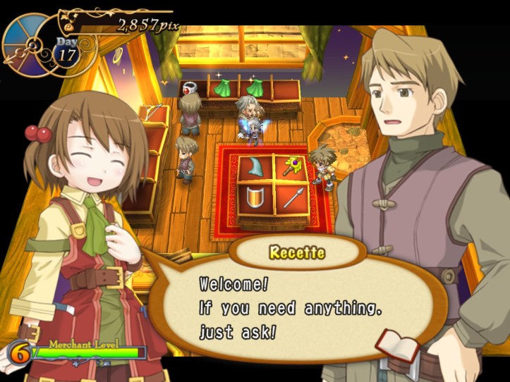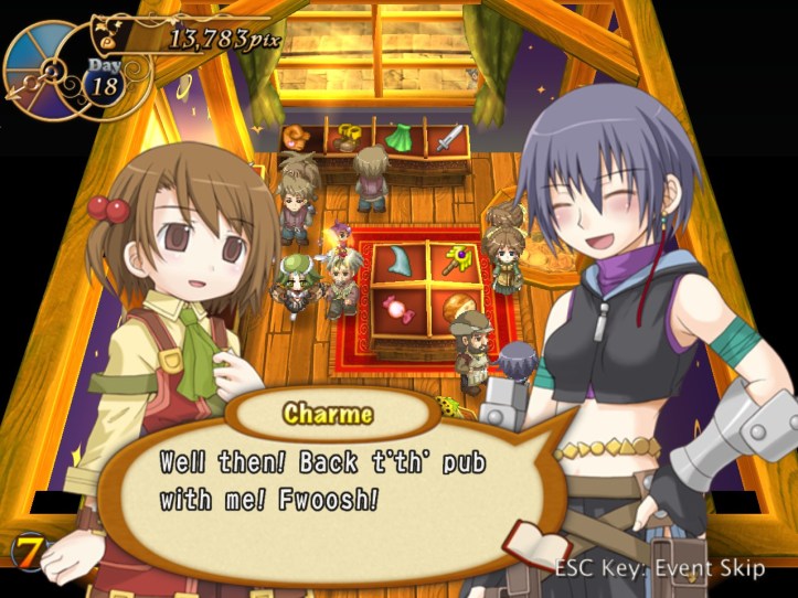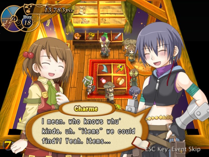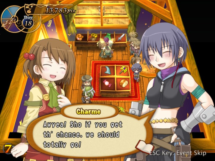 Right, buy and sell again! I pick up more stuff from Reg and do one more lot of selling; again, both Arma and Charme are in the store (you can see them on the right there), but nothing unusual happens with them this time.