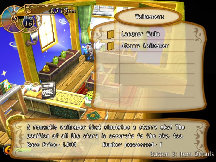 I was just going to start selling straight away, but I think getting to level 6 must have unlocked wallpaper changes because there’s a new option when I go to sit behind the counter. Naturally, I put on some fresh paper! The distraction from the automatic reflex to just go ahead and start selling makes me think that it might be worth popping around the town to see if there’s anything going on first, and if not I’ll just drop in on the Merchant’s Guild to pick up a thing or two.