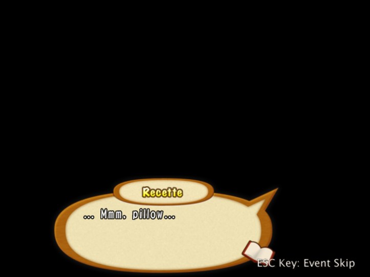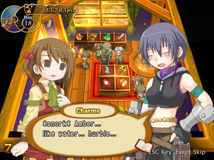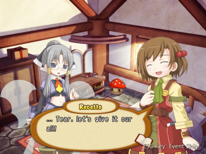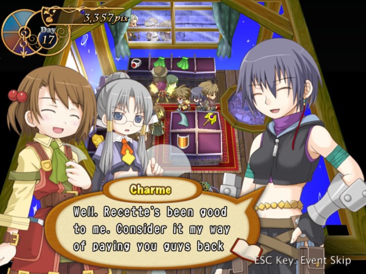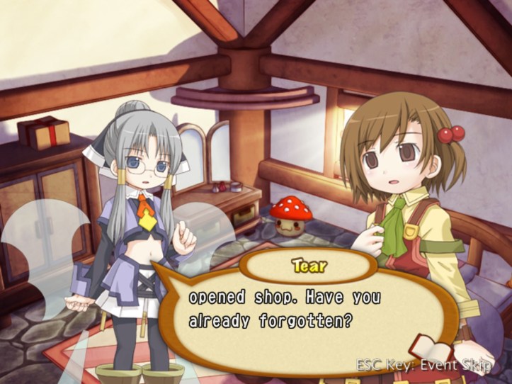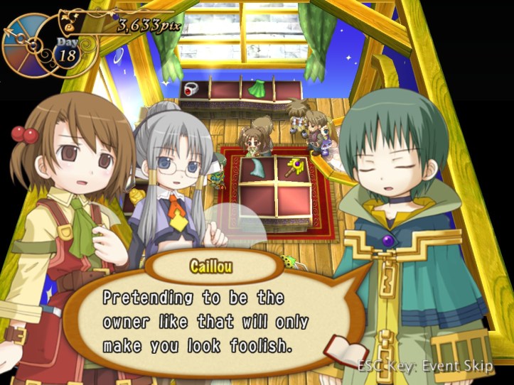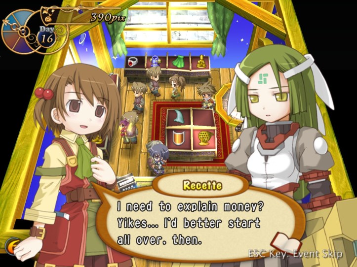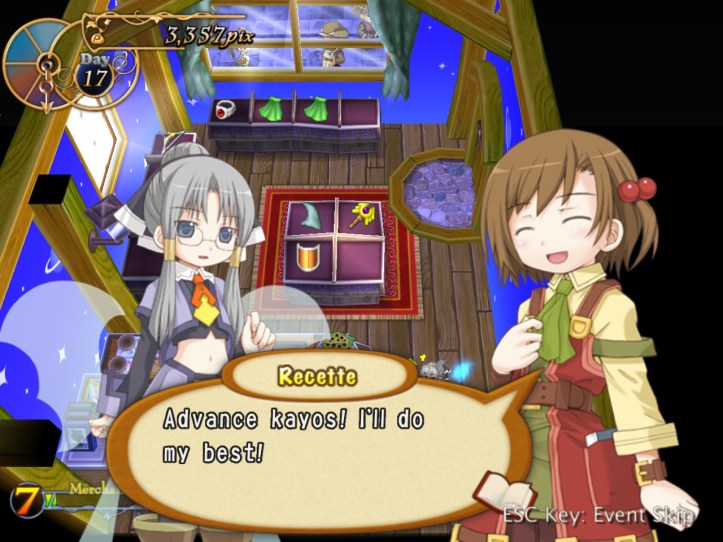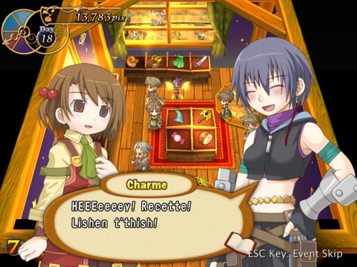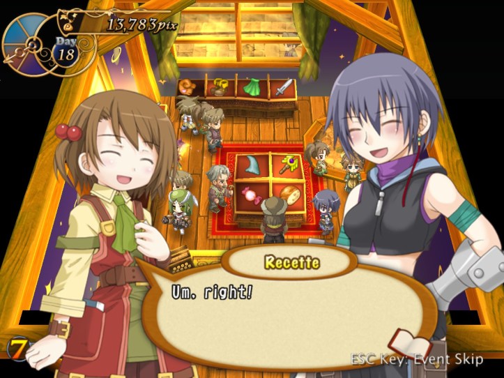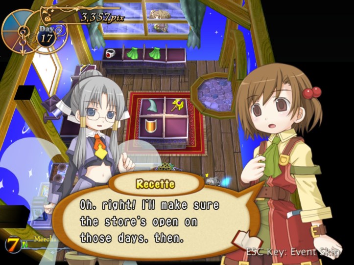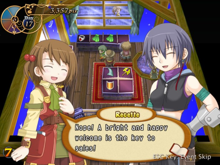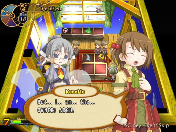 The girls are re-treading the conversation from the beginning of the game, with Recette seeming to half-remember a dream about the store doing well before we got the game over.