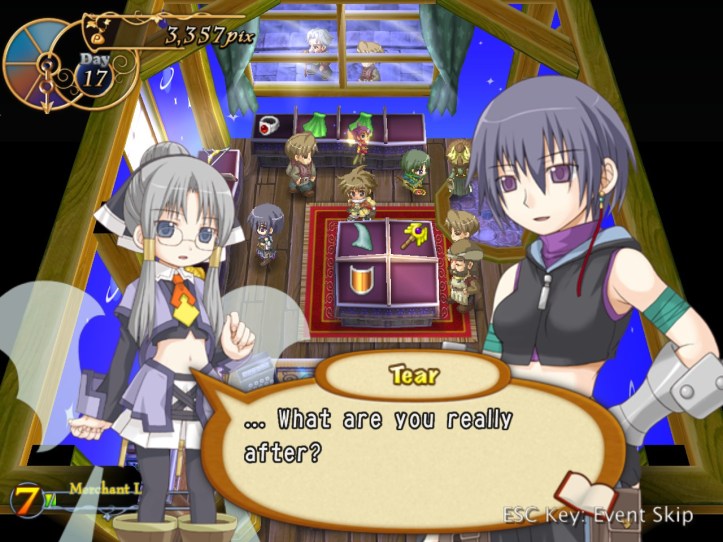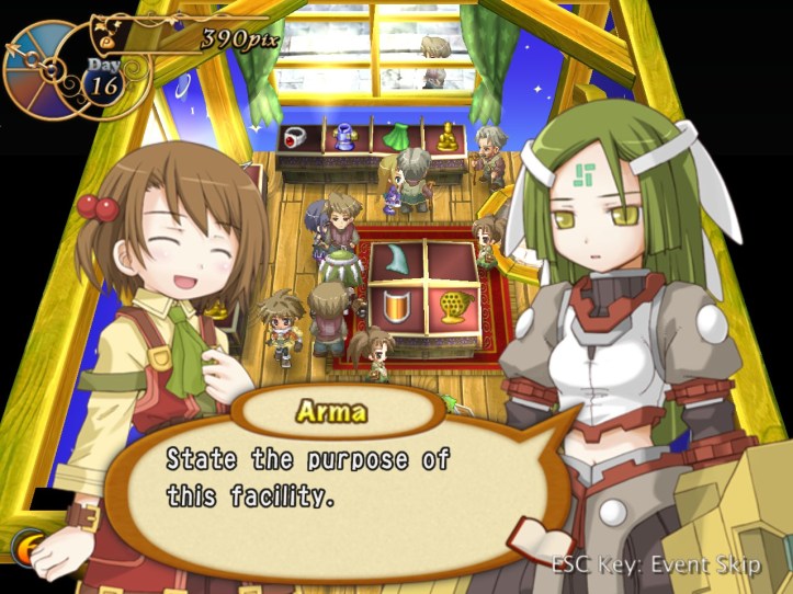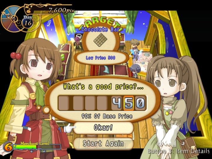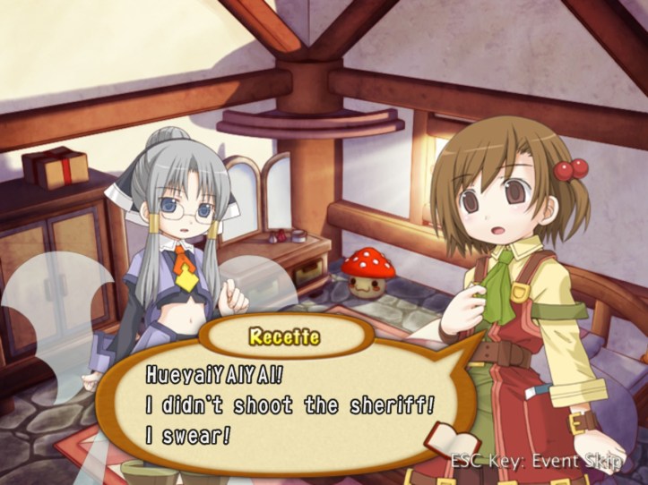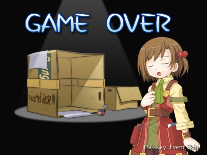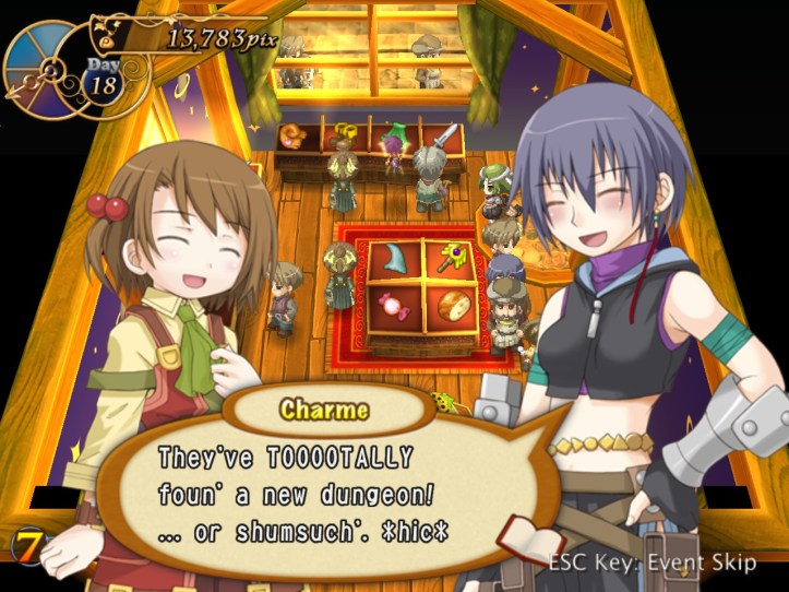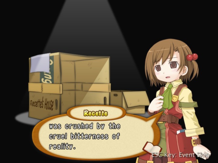 I’ll cut to the chase here: for the rest of the week, I spend some time levelling Charme, during the course of which I meet that weird spear-wielding girl in the dungeon again; Recette tries to give her directions to come visit the shop, but it doesn’t go all that well. We do, however, learn that she has a name, and it’s Nagi! I actually think that Charme might be too fast for me, as I seem to be much worse at using her than I was with Louie. We meet Charme in the pub, too, where she sort-of-introduces us to a guy who looks like another possible adventurer and who keeps drinking more than he can afford; we later catch up with the guy, who’s named Elan, in the square, and it seems he’s a kid-loving fellow who’s fallen on some hard times. Back in the pub, Charme also tries to get Recette drunk and possibly take her home with her, so… that’s a thing. I also do some buy-from-Reg-sell-to-punters work. It’s not enough – in fact, it’s so far away from being anything remotely close to enough that it’s kind of hilarious – so let’s see what happens when we fail!
