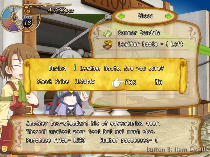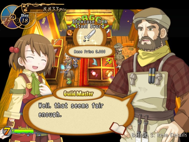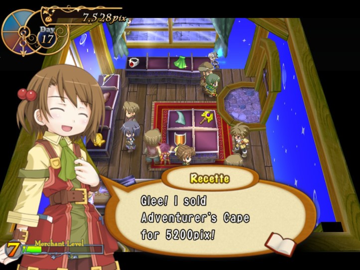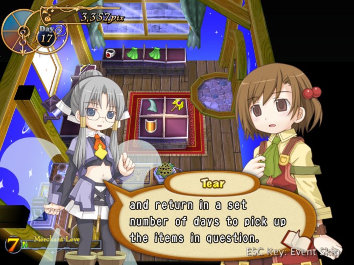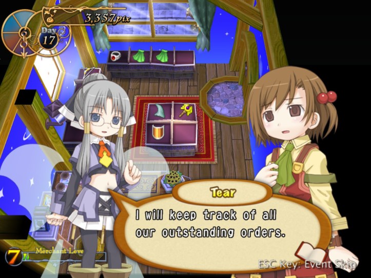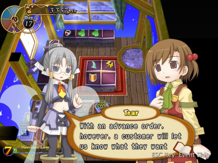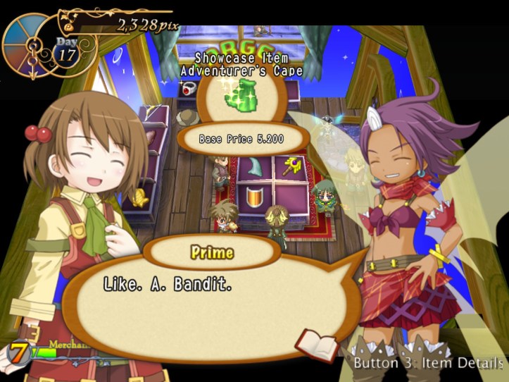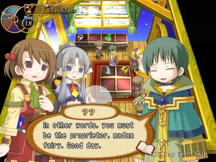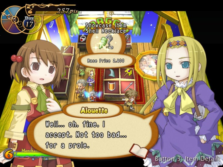 I’ve seen Prime hovering around the store a few times, but she’s never come to the counter. I wonder who she wants the cape for… it’s not for her, because she’s a tiny fairy, and Alouette doesn’t strike me as the adventuring type. I guess they’ve probably got hired adventurers of their own, now I think about it – heck, maybe they even use Louie!