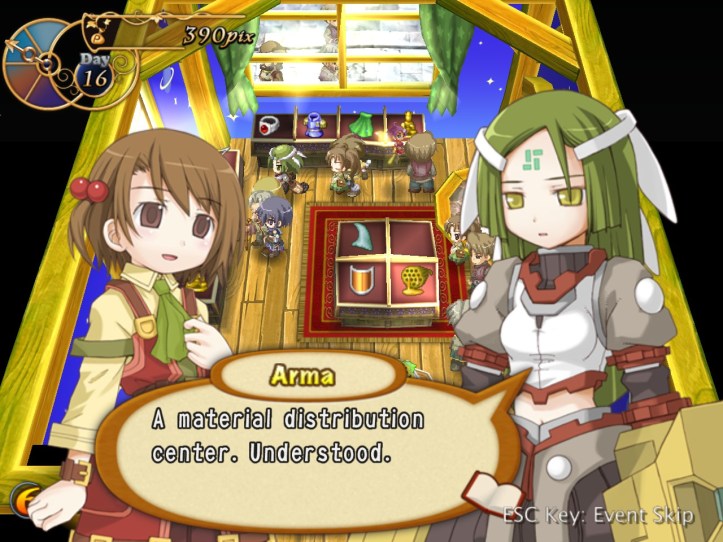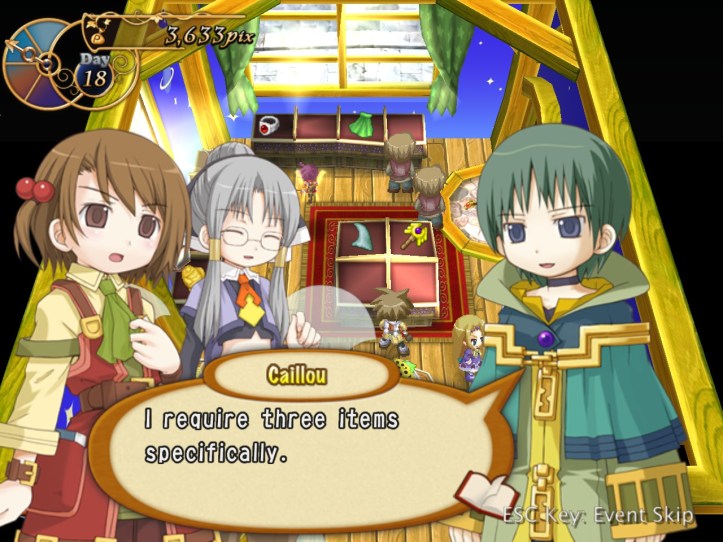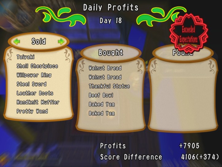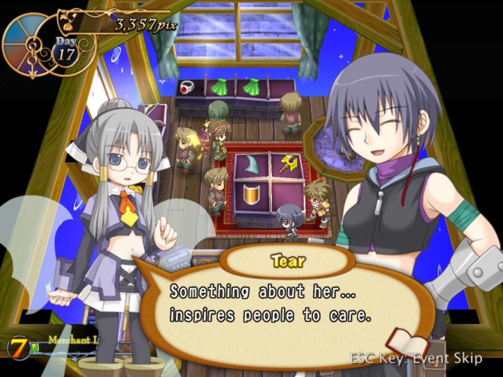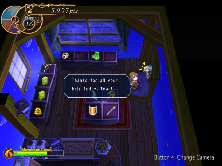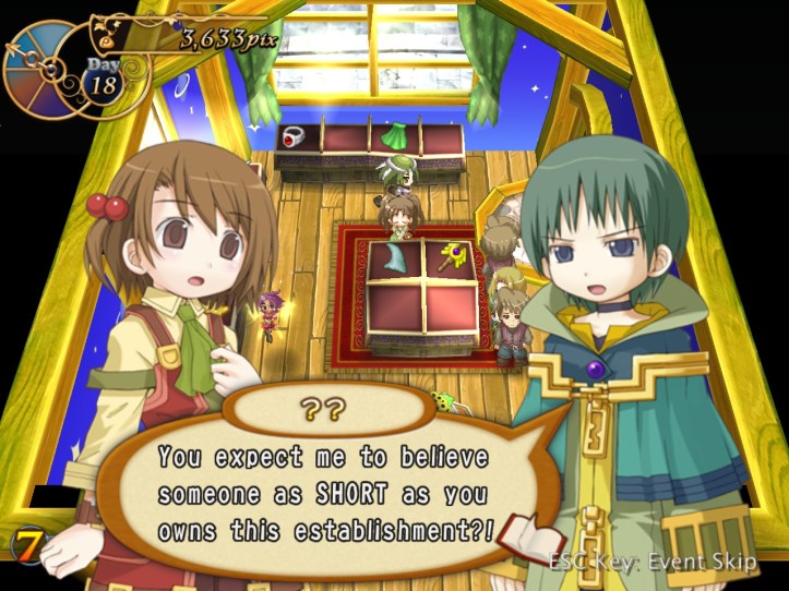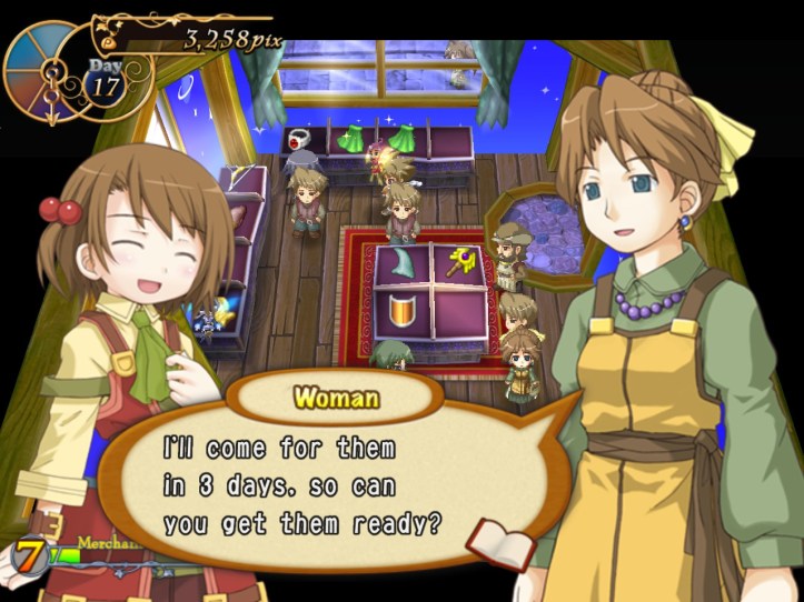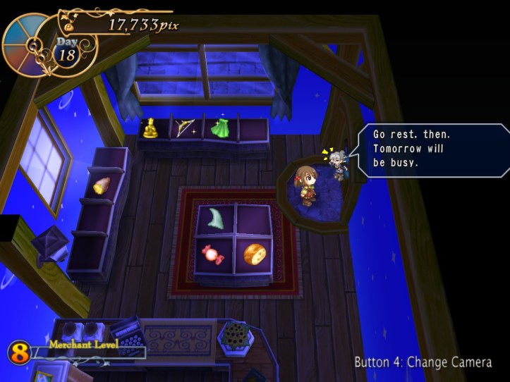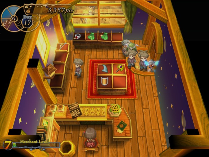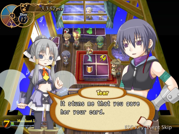 I’ve seen Prime hovering around the store a few times, but she’s never come to the counter. I wonder who she wants the cape for… it’s not for her, because she’s a tiny fairy, and Alouette doesn’t strike me as the adventuring type. I guess they’ve probably got hired adventurers of their own, now I think about it – heck, maybe they even use Louie!