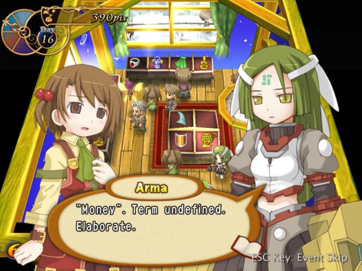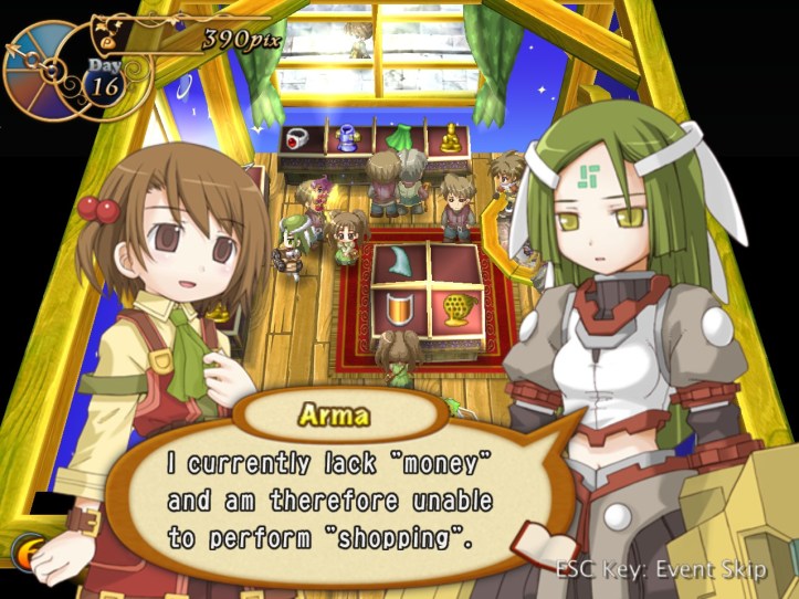 Over the next day or so, Arma does actually come in and buy something, so clearly she’s worked out what money is and how to acquire it (hopefully through legitimate means). Alouette also shows up; I wonder whether she’s going to be selling the stuff she bought off me in her own store… There’s also this one guy who keeps showing up and can never afford anything. I mean, I tried to sell him some walnut bread for 90pix and he just walked out straight away without even giving me the opportunity to haggle. He’s trouble… can I get Louie to kill him?