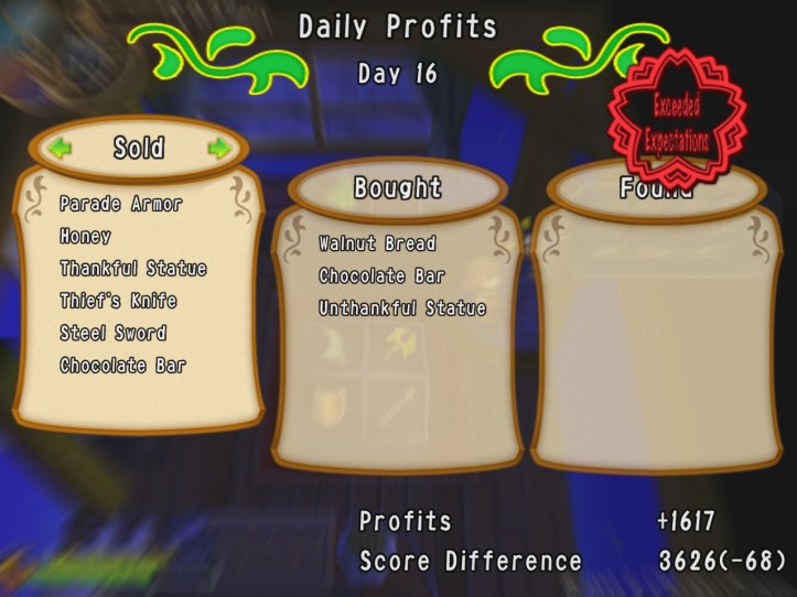 Nowhere else is flashing, so I pay Reg a visit and pick up a very expensive piece of armour to put in my window and hopefully attract some punters. Shelves replenished, let’s try to start making a dent in that 80,000. I can’t believe I’m even saying that. I mean, come on, in what world is that a reasonable increase?!