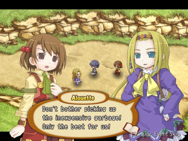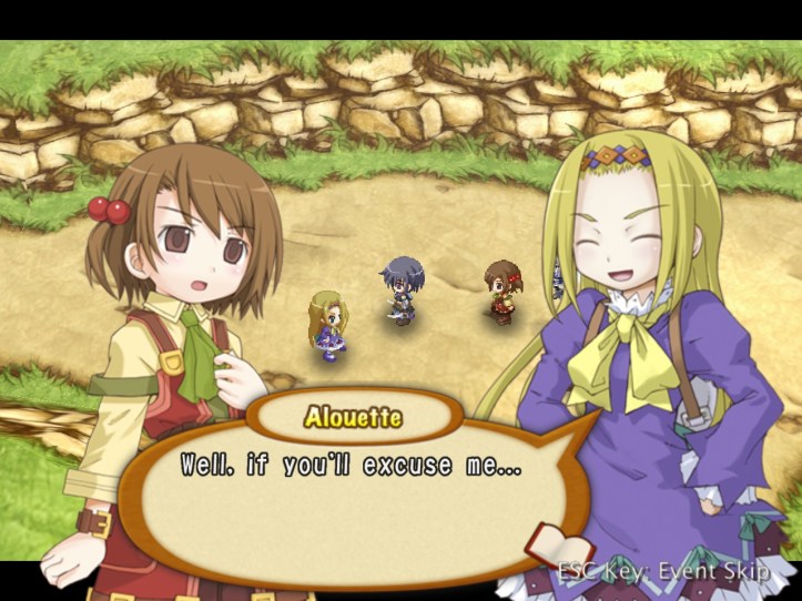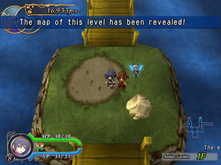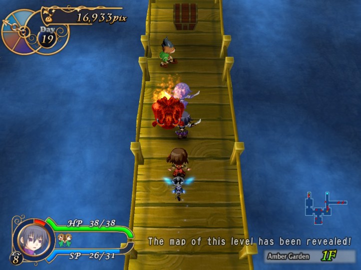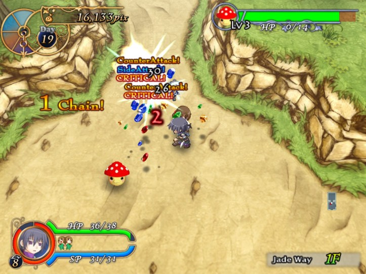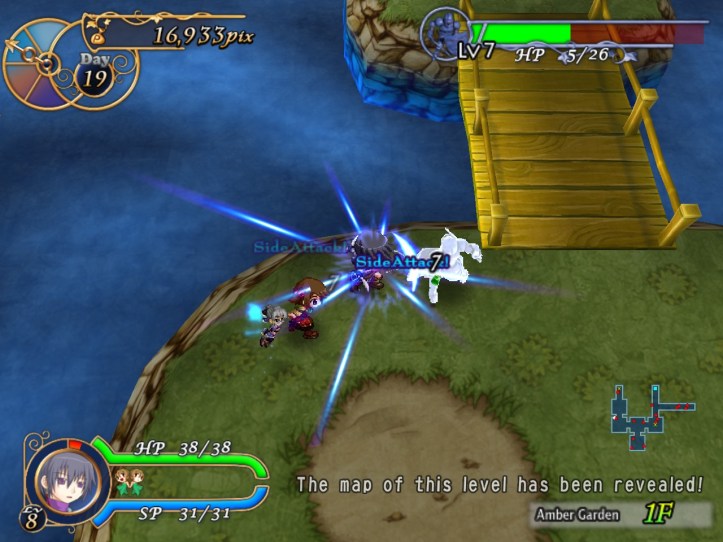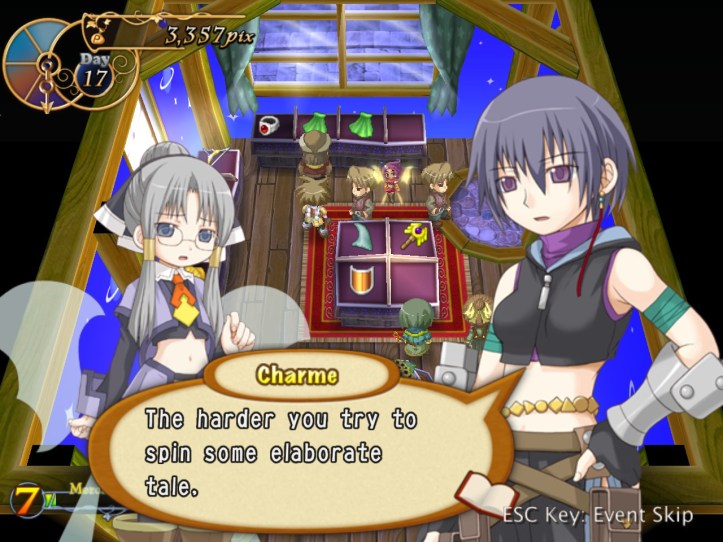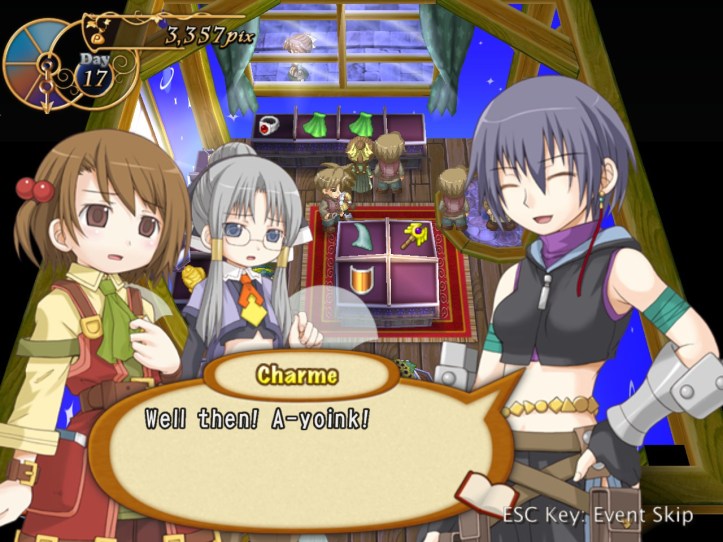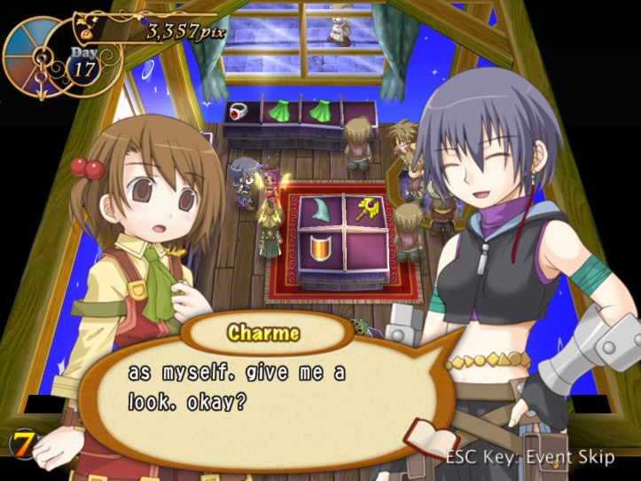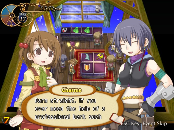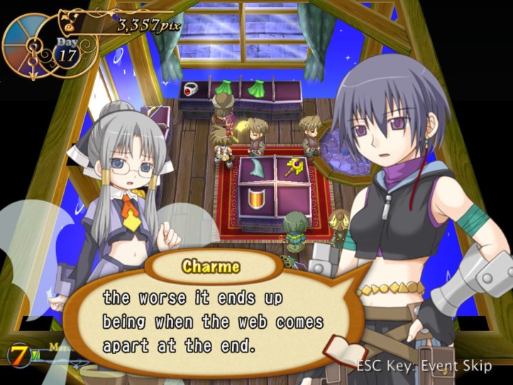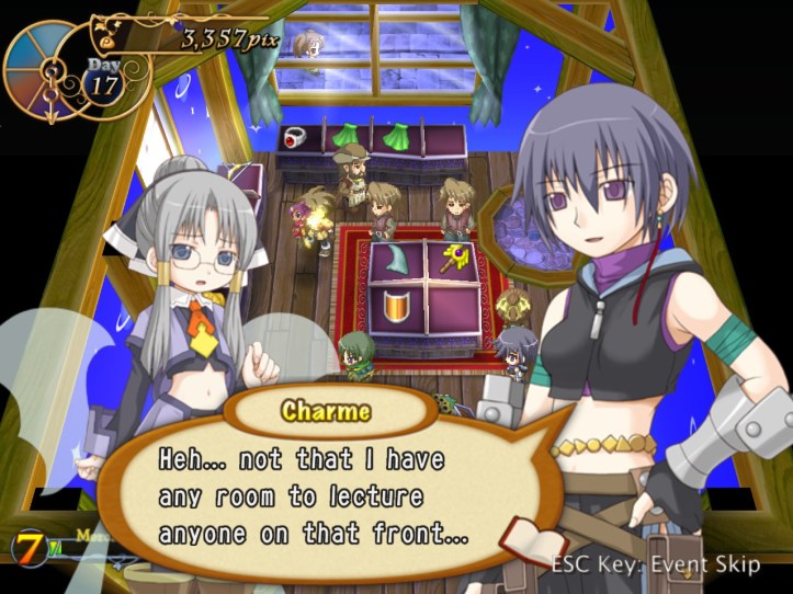 I spend my remaining hours of the day doing exactly that, hoping to level Charme up to the point where her stats are close enough to Louie’s that her advanced speed will actually come into play better. While I’m at it, I discover that she has an even-speedier dash ability; not sure whether Louie had one too and I just never found it. I don’t think it costs any SP, which is nice.