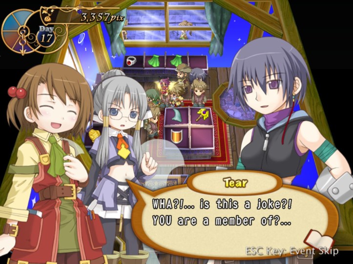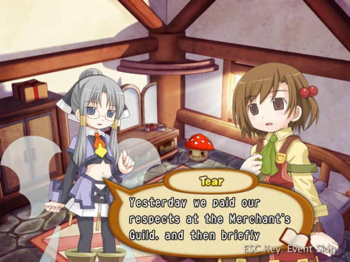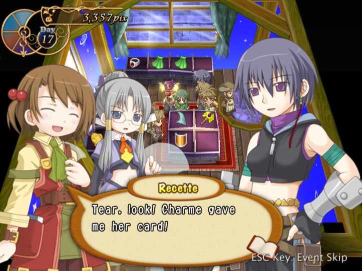 Recette’s super stoked; Tear’s just astonished that Charme’s a member of the Guild. Charme asks to borrow Tear, which Recette agrees to as long as she gives her back in the same state she found her.