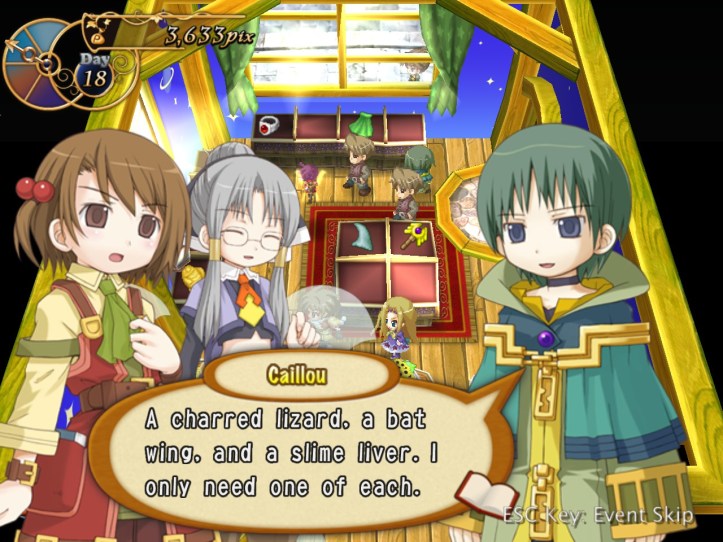 I really don’t like this dude. He introduces himself as Caillou, a magician who wants to place an order for some ‘reagants’. Not sure what counts as a reagant – we’ve got some medicine? Who knows. I’m happy to take this guy’s order and then disappoint him.