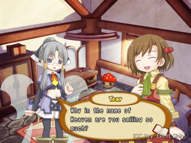 Their chat is surprisingly… intimate, and honest. Charme sees that Tear isn’t as uncaring as she makes out; why else would she be helping Recette rather than just stealing the house and calling it a day? Tear tries to protest that it’s just her job, but: