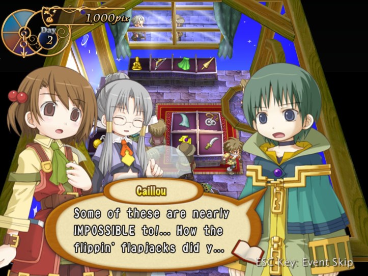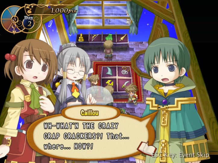 - Suffice to say, Caillou’s very impressed with how great our store is, though he still won’t believe that Recette’s anything more than a ‘counter-jockey’. We get 11,400pix from him for the three items, which means that on the very first day I’ve already got enough to meet the first week’s payment!