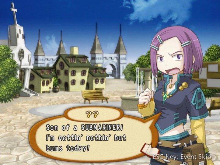 - Speaking of Louie, we run into him in the pub. He’s trying to get a bit of cash by doing the quests people have put on the board, but they’re all ridiculous. He’s hot-headed enough to say he’ll just go and do them anyway, prompting Recette to muse that he reminds her a bit of her dad. (You know, the one who left his young daughter to pay back a massive debt alone and vanished fighting a dragon. It’s a compliment.)