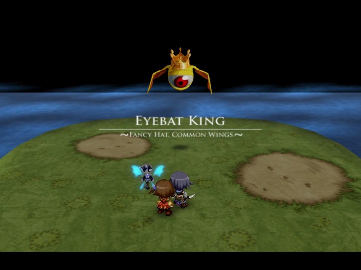 - Like the Crowned Slime and Reginald Drisby before him, he’s got adds in the form of smaller eyebat things. He packs a bit of a punch himself, too, but the challenge is keeping up with him as he floats around while also avoiding the attacks of the many little bats (I can’t take them out quick enough to eliminate their presence entirely, so I suspect they’re coded to keep their numbers around four or five on the field at all times.)