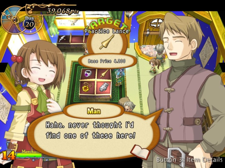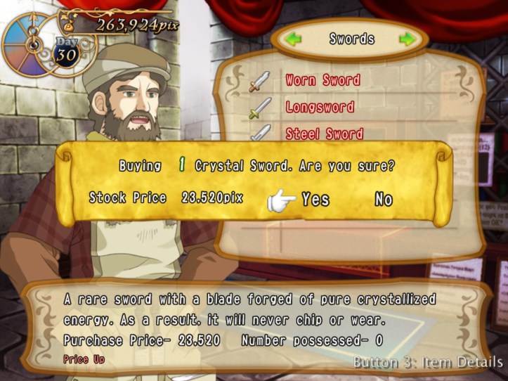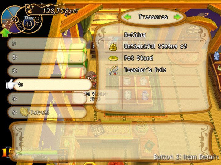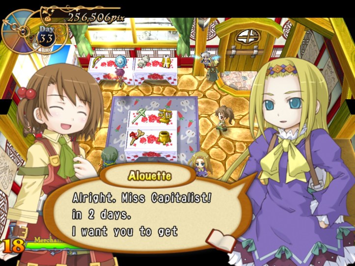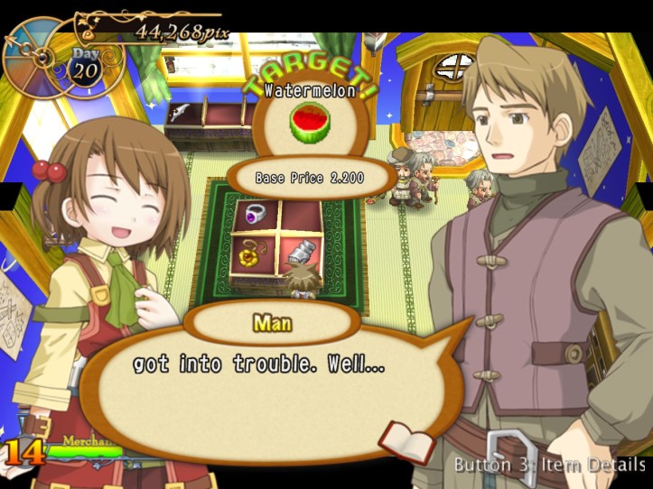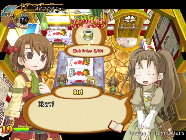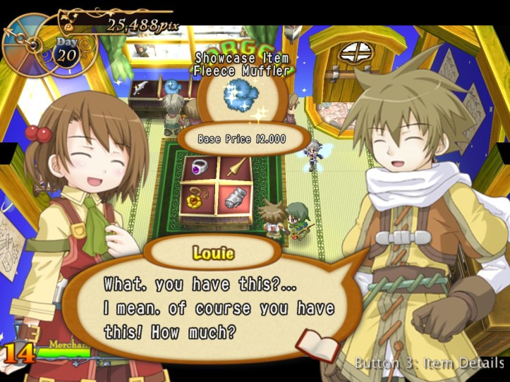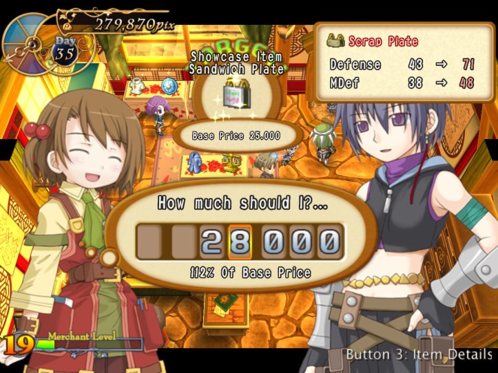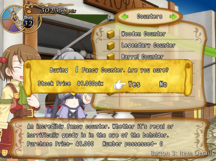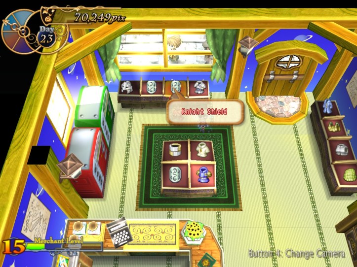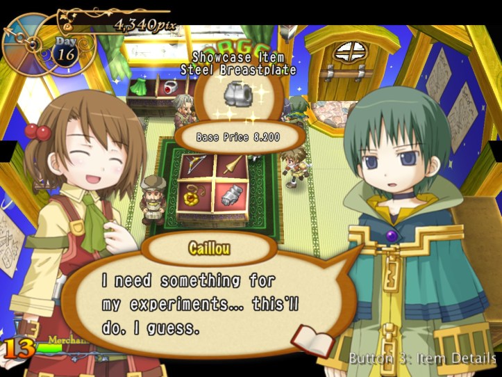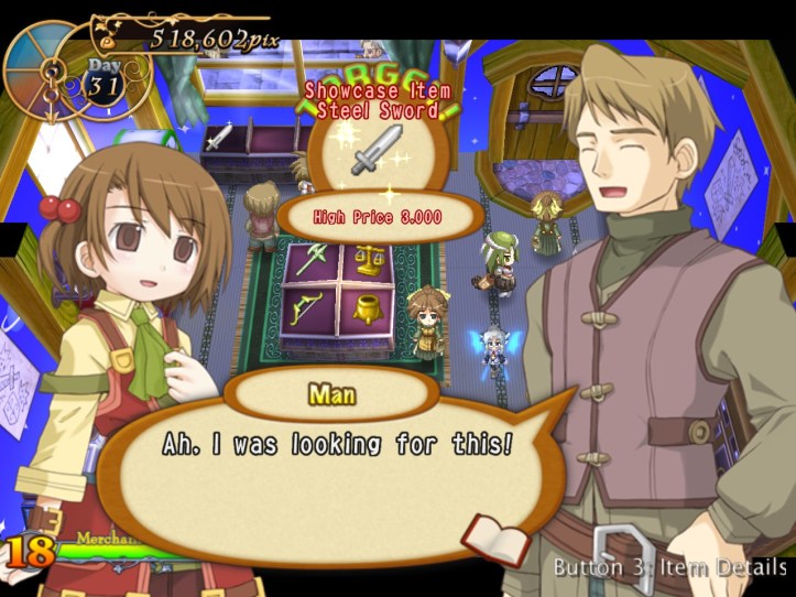 Caillou pops in and picks up some bits, as do Charme and some of the other lovely generic townspeople. I’m learning that I can ask for a bit more of a mark-up lately, perhaps because I’ve built up some good will. Either way, my first loop strategy of asking low and hoping it’d give me the best chance of a deal probably wasn’t the best way of making cash.